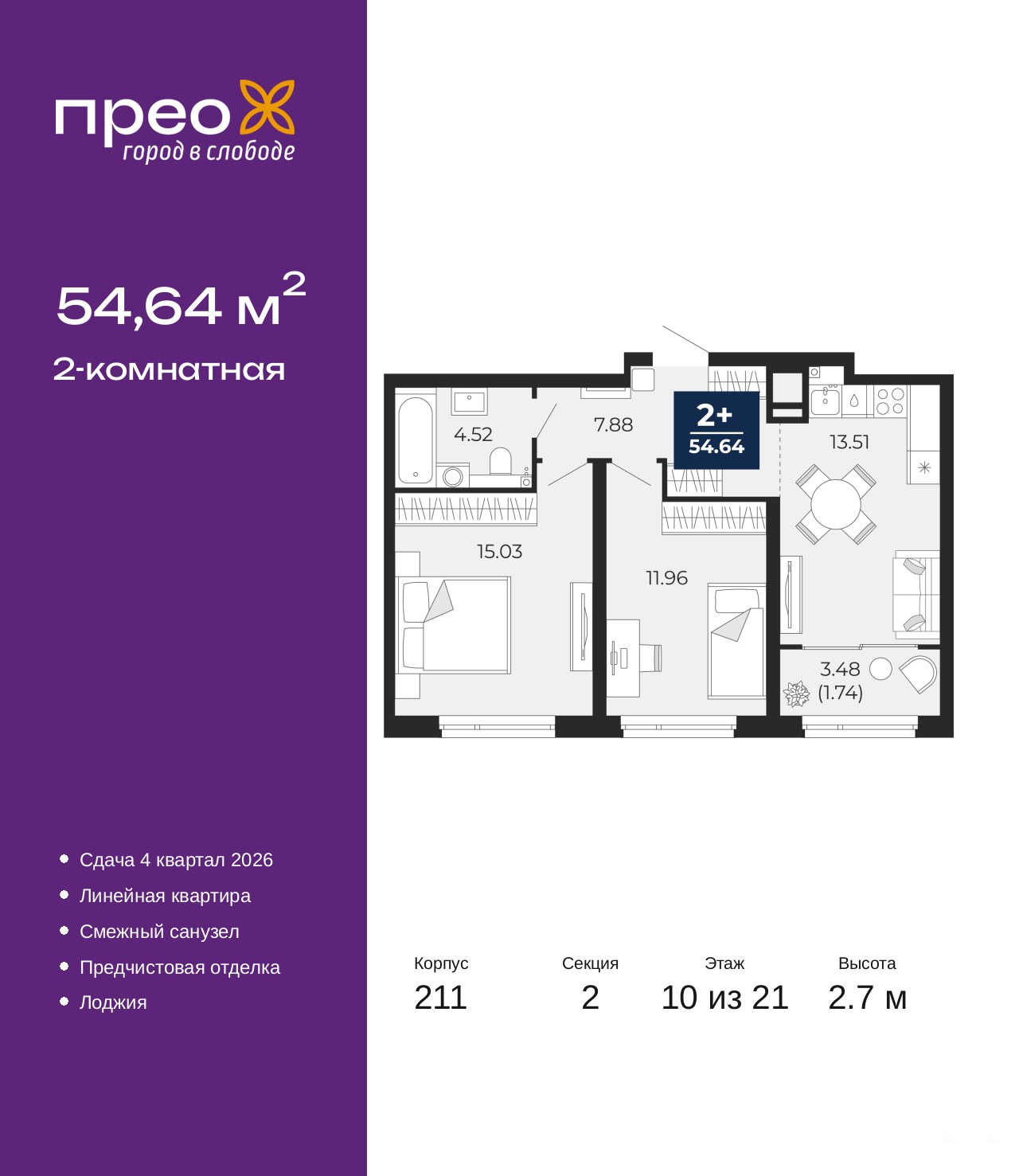 Двухкомнатная квартира с предчистовой отделкой в ЖК "Прео" на 10 этаже. Общая площадь: 54.64 кв.м., жилая: 26.99 кв.м., площадь просторной кухни-столовой: 13.51 кв.м. Комнаты изолированные, все окна выходят на одну сторону. В квартире одна лоджия, один совмещенный санузел. Высота потолков 2.7 м.