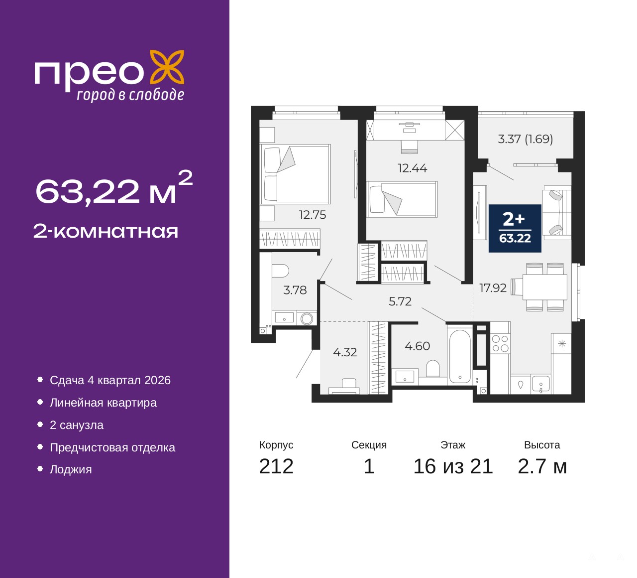 2-комн. квартира от застройщика с предчистовой отделкой в ЖК "Прео" на 16 этаже. Общая площадь: 63.22 кв.м., жилая: 25.19 кв.м., площадь просторной кухни-столовой: 17.92 кв.м. Комнаты изолированные, все окна выходят на одну сторону. В квартире одна лоджия, один совмещенный и один раздельный санузел. Высота потолков 2.7 м.