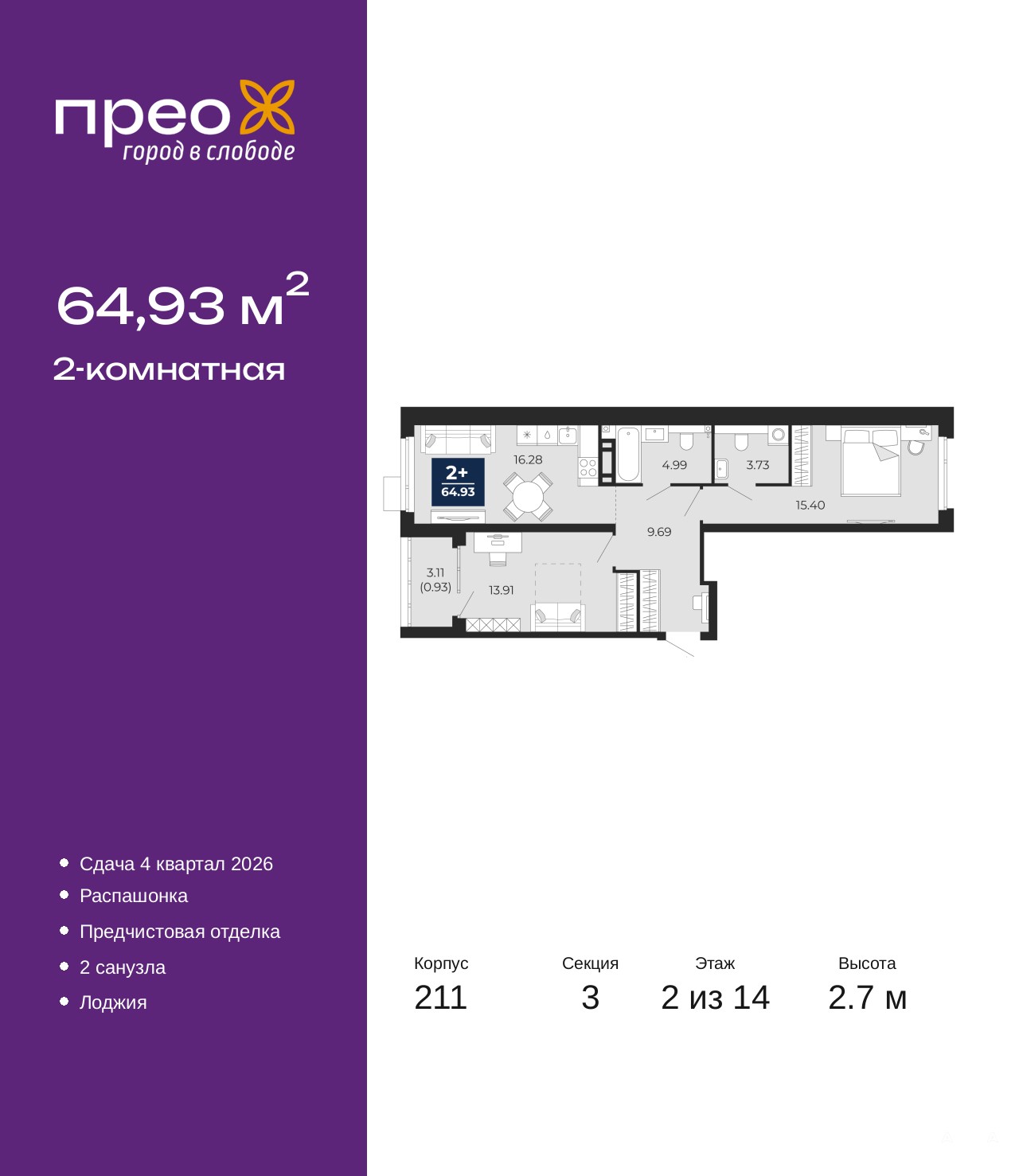 2-комн. квартира с предчистовой отделкой в ЖК "Прео" на 2 этаже. Общая площадь: 64.93 кв.м., жилая: 29.31 кв.м., площадь просторной кухни-столовой: 16.28 кв.м. Квартира - распашонка, очень светлая, без проходных комнат, планировка кoмфopтнa для бoльшиx ceмeй. В квартире одна лоджия, один совмещенный и один раздельный санузел. Высота потолков 2.7 м.