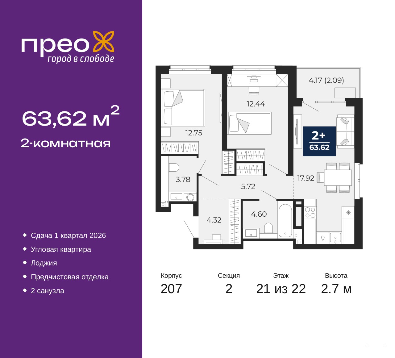 Просторная 2-комн. квартира с предчистовой отделкой в ЖК "Прео" на 21 этаже. Общая площадь: 63.62 кв.м., жилая: 25.19 кв.м., площадь просторной кухни-столовой: 17.92 кв.м. Угловая квартира, очень светлая, естественная вентиляция при открытии окон. В квартире одна лоджия, один совмещенный и один раздельный санузел. Высота потолков 2.7 м.