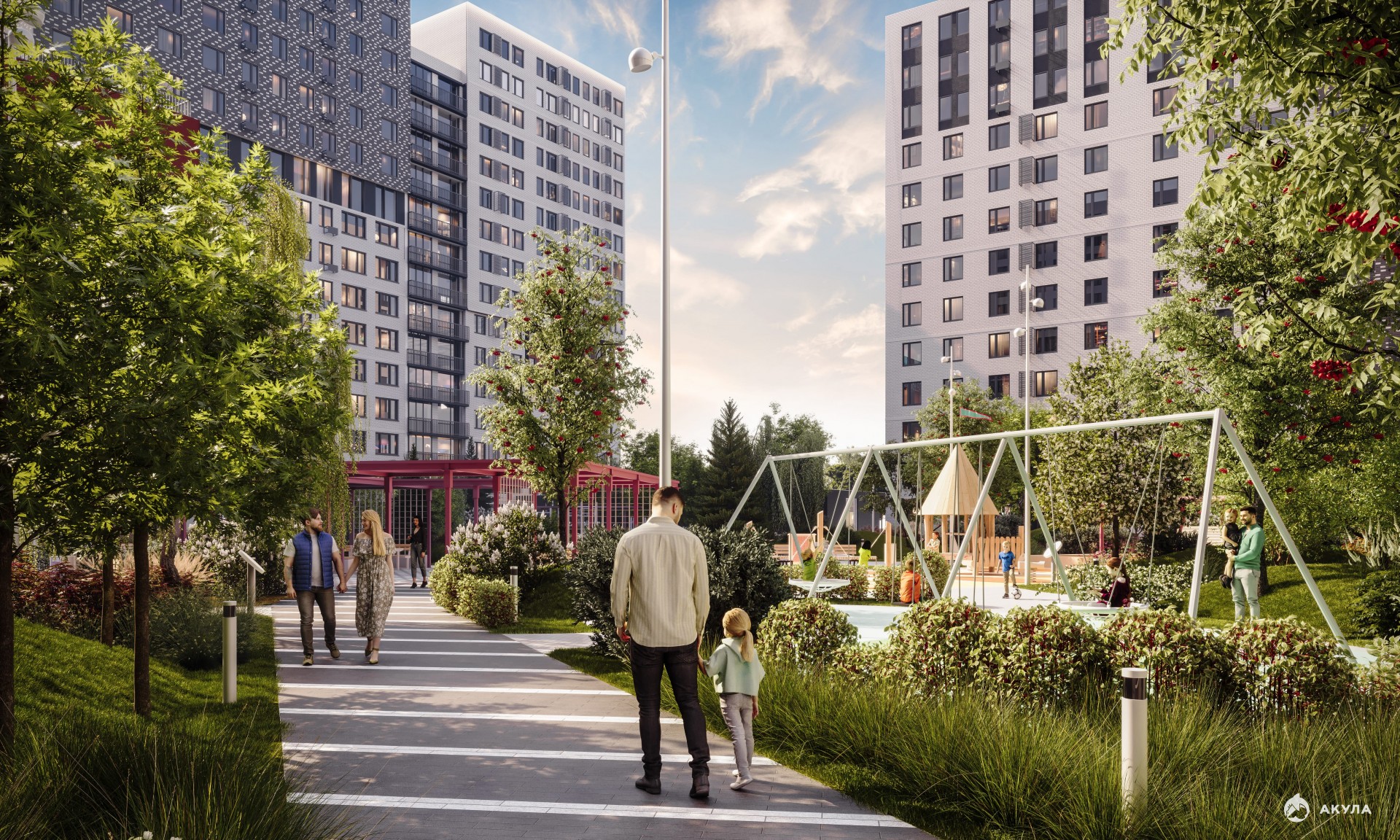 Благоустройство прилегающей территории включает в себя организацию детских и спортивных площадок, зон отдыха и озеленение. Предусмотрены открытые гостевые парковки и многоуровневый паркинг.