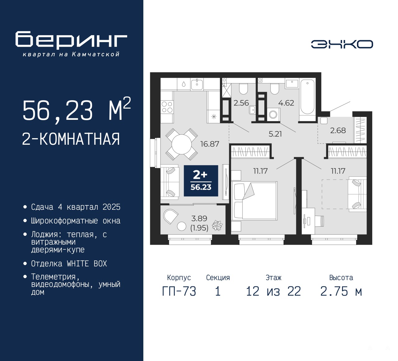 Продается 2-комн. квартира от застройщика в ЖК "Беринг" на 12 этаже. Квартира без отделки, новый собственник может сделать ремонт по индивидуальному проекту. Общая площадь: 56.23 кв.м., жилая: 22.34 кв.м., площадь просторной кухни-столовой: 16.87 кв.м. Угловая квартира, идеально подойдет любителям тишины и панорамных видов. В квартире одна лоджия, один совмещенный и один раздельный санузел. Высота потолков 2.75 м.