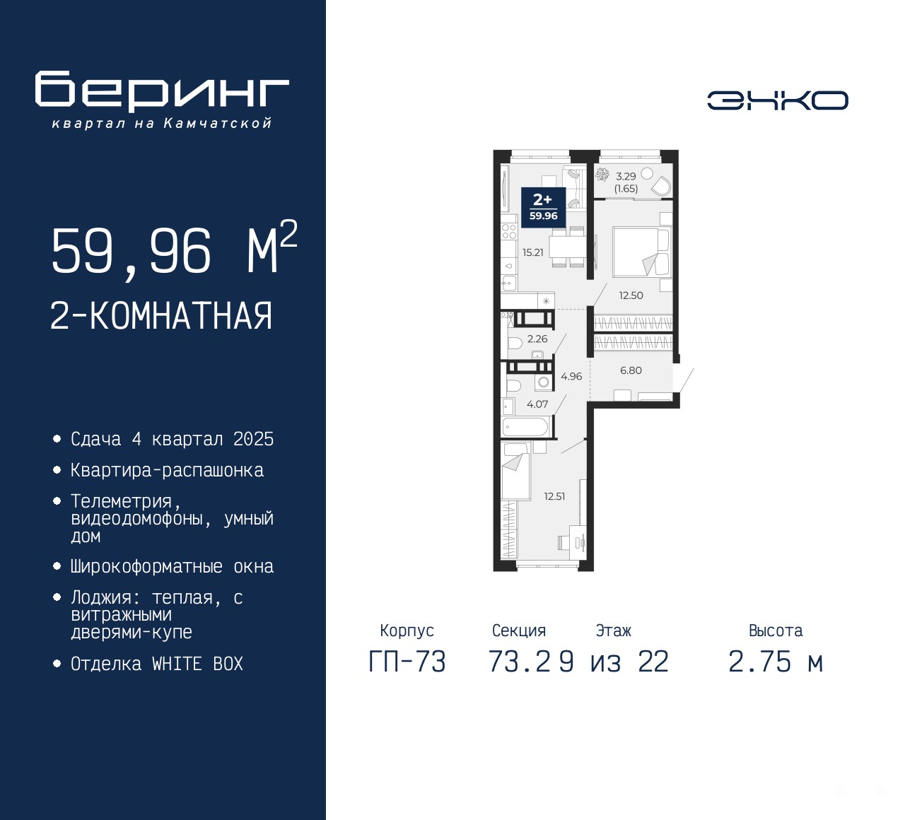 Двухкомнатная квартира в ЖК "Беринг" на 9 этаже. Квартира без отделки, новый собственник может сделать ремонт по индивидуальному дизайн-проекту. Общая площадь: 59.96 кв.м., жилая: 25.01 кв.м., площадь просторной кухни-столовой: 15.21 кв.м. Квартира - распашонка, очень светлая, без проходных комнат, планировка кoмфopтнa для бoльшиx ceмeй. В квартире одна лоджия, один совмещенный и один раздельный санузел. Высота потолков 2.75 м.
