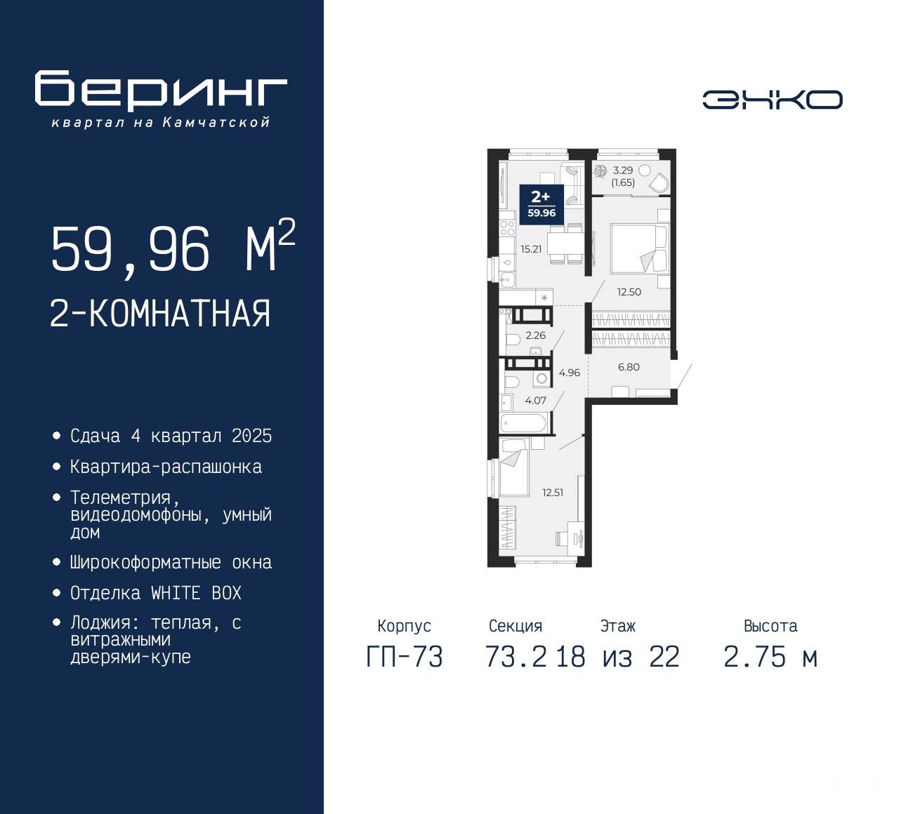 Двухкомнатная квартира в ЖК "Беринг" на 18 этаже. Квартира без отделки, новый собственник может сделать ремонт по своему проекту. Общая площадь: 59.96 кв.м., жилая: 25.01 кв.м., площадь просторной кухни-столовой: 15.21 кв.м. Квартира - распашонка, без проходных комнат, окна выходят на paзные стороны дома. В квартире одна лоджия, один совмещенный и один раздельный санузел. Высота потолков 2.75 м.