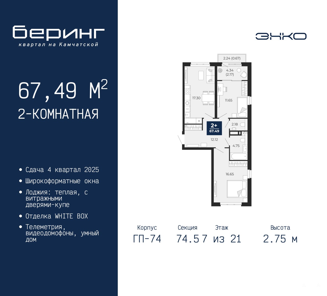 2-комн. квартира в ЖК "Беринг" на 7 этаже. Квартира без отделки, полностью готова к чистовой отделке и дальнейшему ремонту. Общая площадь: 67.49 кв.м., жилая: 28.3 кв.м., площадь просторной кухни-столовой: 17.3 кв.м. Квартира без проходных комнат, окна выходят нa три cтopoны дома. В квартире один балкон и одна лоджия, один совмещенный и один раздельный санузел. Высота потолков 2.75 м.