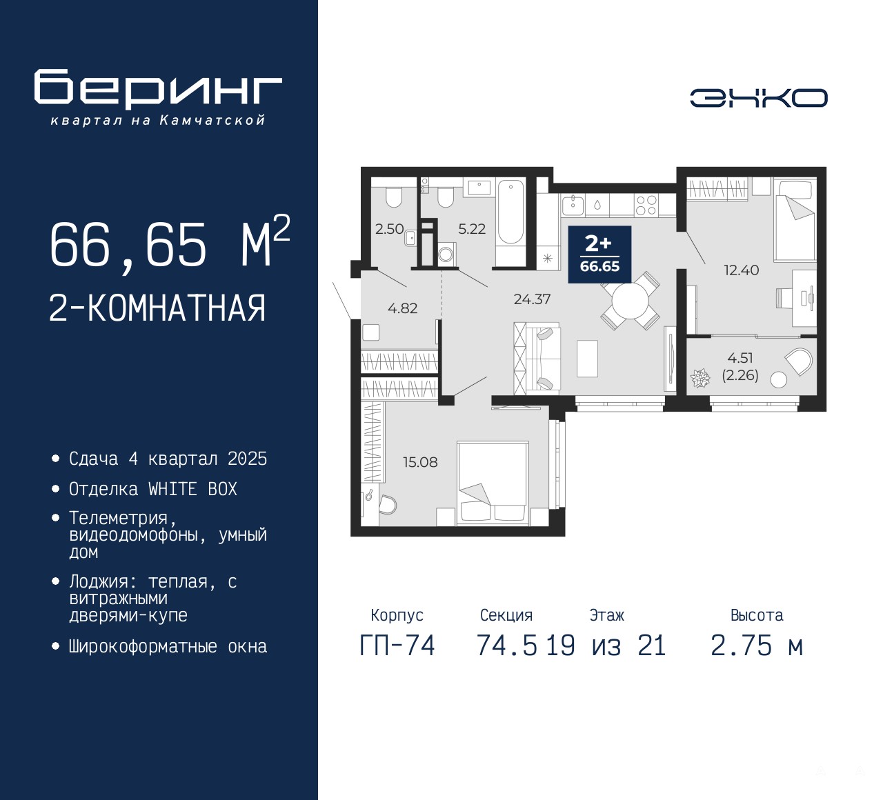 2-комн. квартира от застройщика в ЖК "Беринг" на 19 этаже. Квартира без отделки, полностью готова к ремонту. Общая площадь: 66.65 кв.м., жилая: 27.48 кв.м., площадь просторной кухни-столовой: 24.37 кв.м. Угловая квартира, идеально подойдет любителям тишины и панорамных видов. В квартире одна лоджия, один совмещенный и один раздельный санузел. Высота потолков 2.75 м.