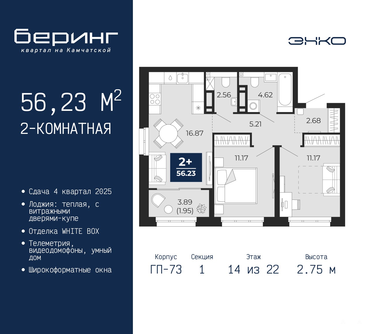 Продается 2-комн. квартира в ЖК "Беринг" на 14 этаже. Квартира без отделки, новый собственник может сделать ремонт по индивидуальному проекту. Общая площадь: 56.23 кв.м., жилая: 22.34 кв.м., площадь просторной кухни-столовой: 16.87 кв.м. Квартира угловая, идеально подойдет любителям тишины и панорамных видов. В квартире одна лоджия, один совмещенный и один раздельный санузел. Высота потолков 2.75 м.