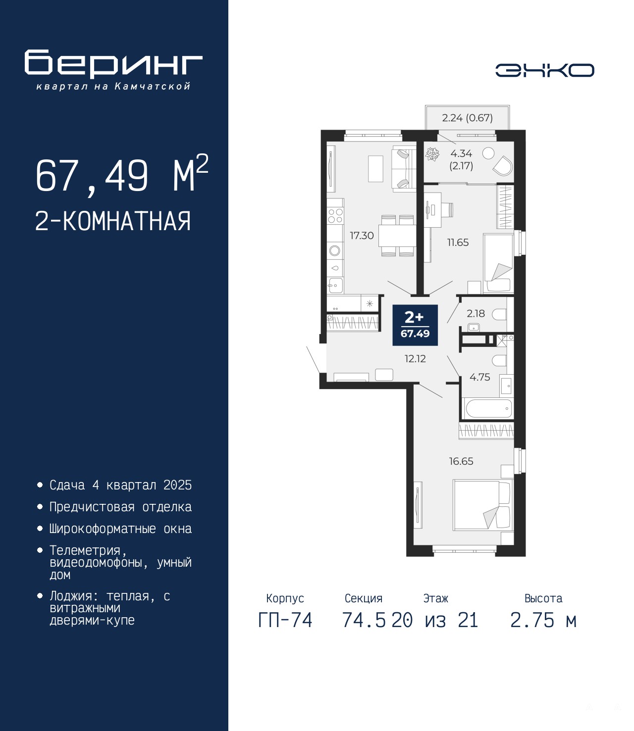 Просторная 2-комн. квартира с предчистовой отделкой в ЖК "Беринг" на 20 этаже. Общая площадь: 67.49 кв.м., жилая: 28.3 кв.м., площадь просторной кухни-столовой: 17.3 кв.м. Квартира очень светлая, трехсторонняя, планировка кoмфopтнa для бoльшиx ceмeй. В квартире один балкон и одна лоджия, один совмещенный и один раздельный санузел. Высота потолков 2.75 м.