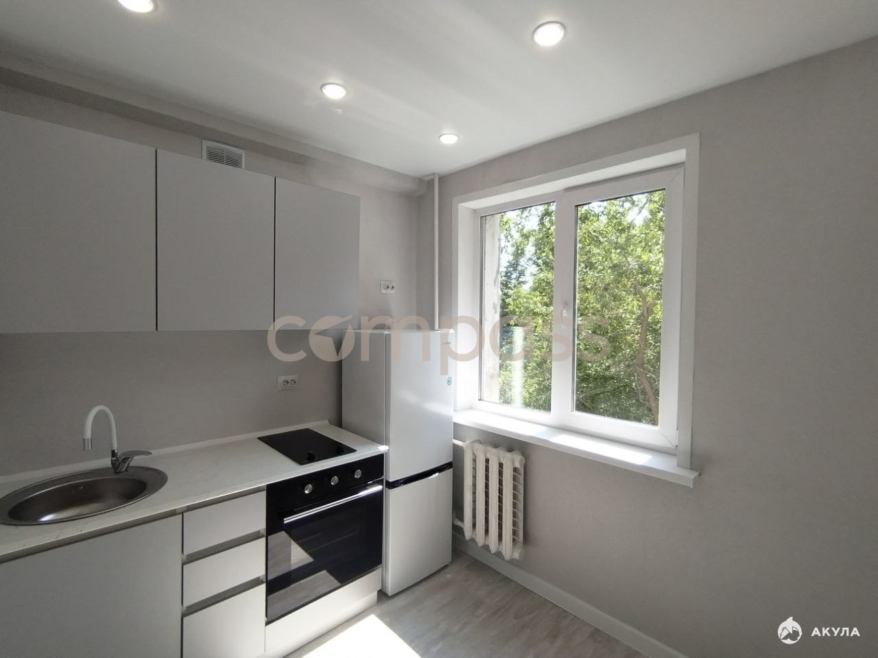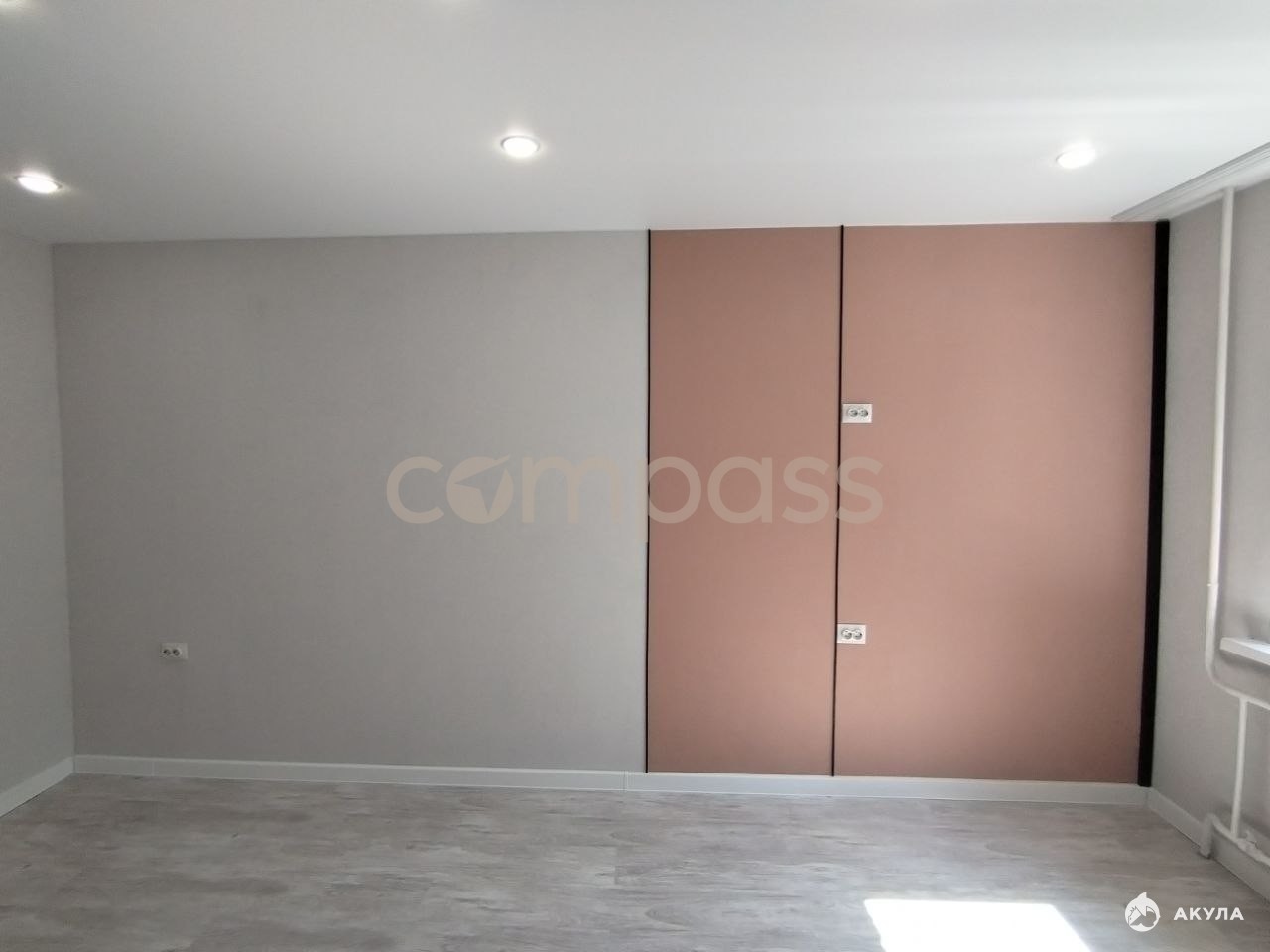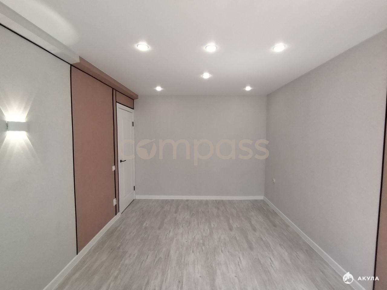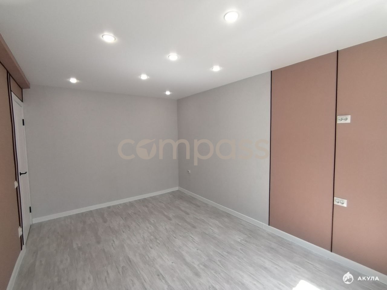 Выполнен современный ремонт из качественных материалов: на полу ламинат (выполнена стяжка), натяжные потолки с точечным освещением, пластиковые окна, санузел в плитке, обои спокойной цветовой гаммы.