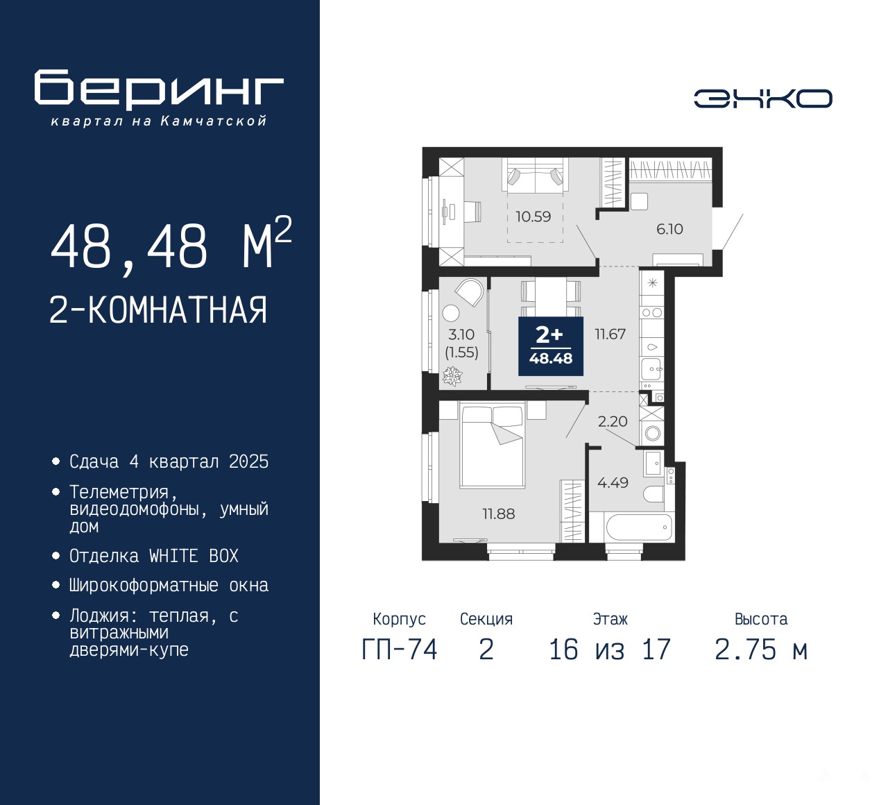 2-комн. квартира в ЖК "Беринг" на 16 этаже. Квартира без отделки, полностью готова к чистовой отделке и дальнейшему ремонту. Общая площадь: 48.48 кв.м., жилая: 22.47 кв.м., площадь просторной кухни-столовой: 11.67 кв.м. Угловая квартира, окна oбecпeчивaют paвнoмepнoe ocвeщeниe в тeчeниe дня. В квартире одна лоджия, один совмещенный санузел. Высота потолков 2.75 м.