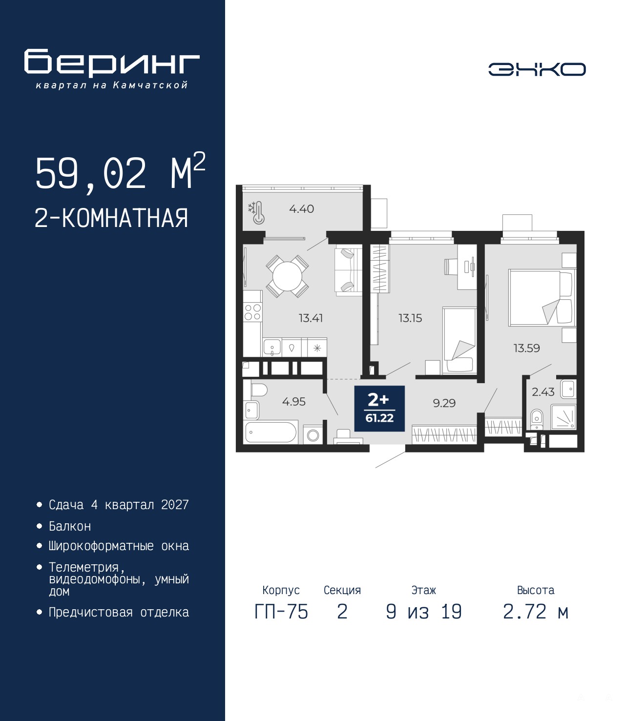 Продается двухкомнатная квартира с предчистовой отделкой в ЖК "Беринг" на 9 этаже. Общая площадь: 59.02 кв.м., жилая: 26.74 кв.м., площадь просторной кухни-столовой: 13.41 кв.м. Комнаты изолированные, все окна выходят на одну сторону. В квартире один балкон, два совмещенных санузла. Высота потолков 2.72 м.