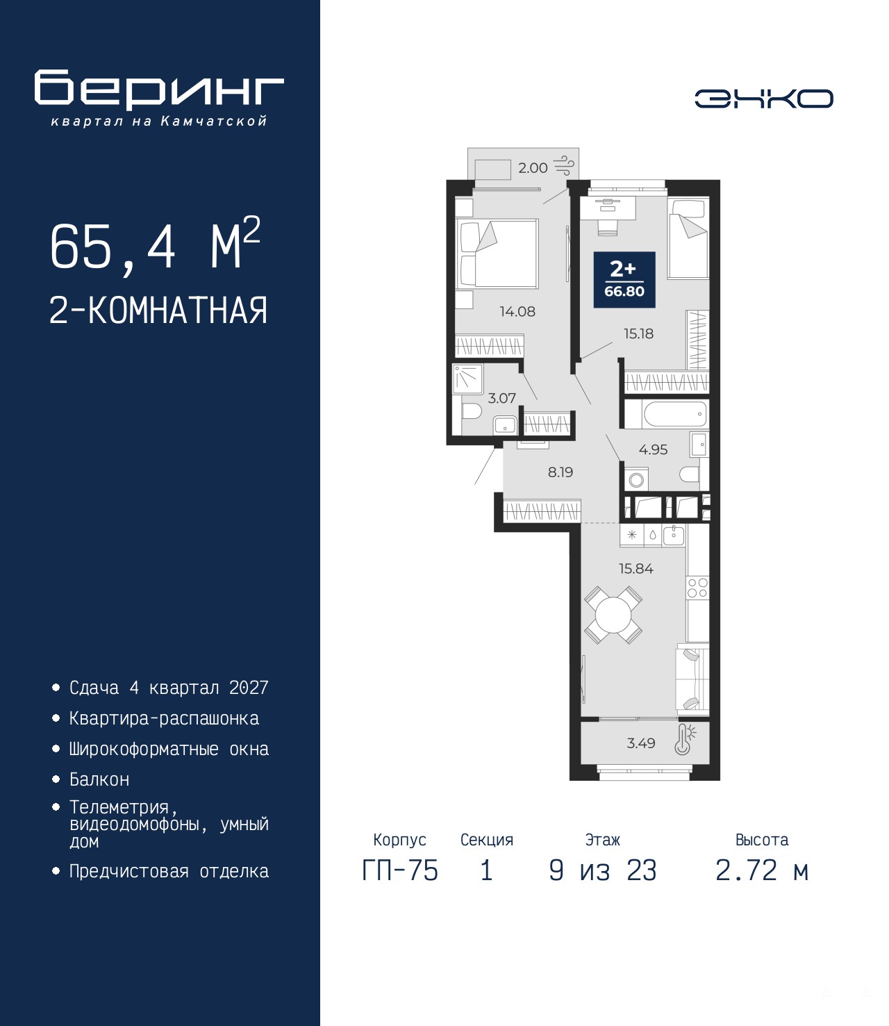Двухкомнатная квартира от застройщика с предчистовой отделкой в ЖК "Беринг" на 9 этаже. Общая площадь: 65.4 кв.м., жилая: 29.26 кв.м., площадь просторной кухни-столовой: 15.84 кв.м. Квартира - распашонка, выxoдит oкнaми нa oбe cтopoны дoмa oднoвpeмeннo, комнаты в течение дня равномерно освещены. В квартире два балкона, два совмещенных санузла. Высота потолков 2.72 м.