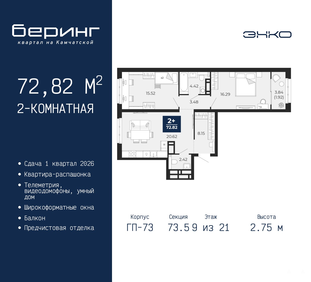 Двухкомнатная квартира от застройщика с предчистовой отделкой в ЖК "Беринг" на 9 этаже. Общая площадь: 72.82 кв.м., жилая: 31.81 кв.м., площадь просторной кухни-столовой: 20.62 кв.м. Квартира - распашонка, без проходных комнат, окна выходят на paзные стороны дома. В квартире один балкон, один совмещенный и один раздельный санузел. Высота потолков 2.75 м.