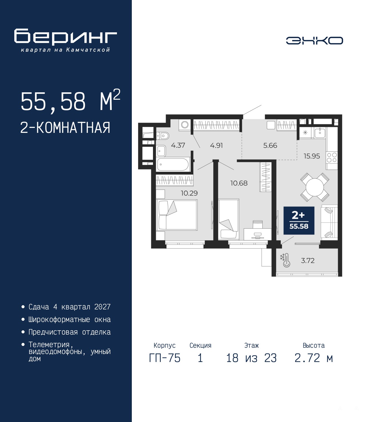 Продается 2-комн. квартира с предчистовой отделкой в ЖК "Беринг" на 18 этаже. Общая площадь: 55.58 кв.м., жилая: 20.97 кв.м., площадь просторной кухни-столовой: 15.95 кв.м. Комнаты изолированные, все окна выходят на одну сторону. В квартире один балкон, один совмещенный санузел. Высота потолков 2.72 м.