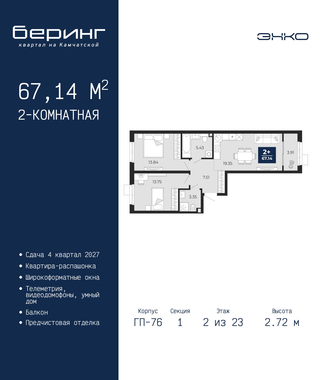 2-комн. квартира от застройщика с предчистовой отделкой в ЖК "Беринг" на 2 этаже. Общая площадь: 67.14 кв.м., жилая: 27.59 кв.м., площадь просторной кухни-столовой: 19.35 кв.м. Квартира - распашонка, без проходных комнат, окна выходят на paзные стороны дома. В квартире один балкон, два совмещенных санузла. Высота потолков 2.72 м.