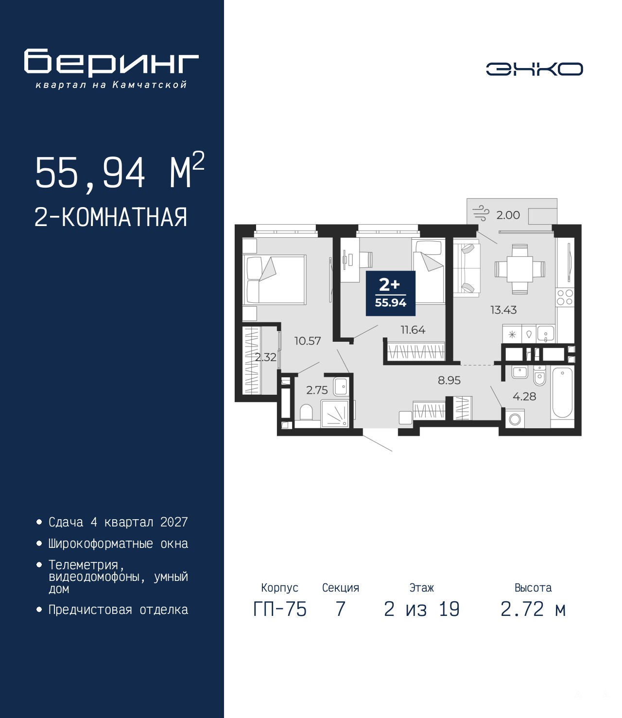 2-комн. квартира от застройщика с предчистовой отделкой в ЖК "Беринг" на 2 этаже. Общая площадь: 55.94 кв.м. Высота потолков 2.72 м.