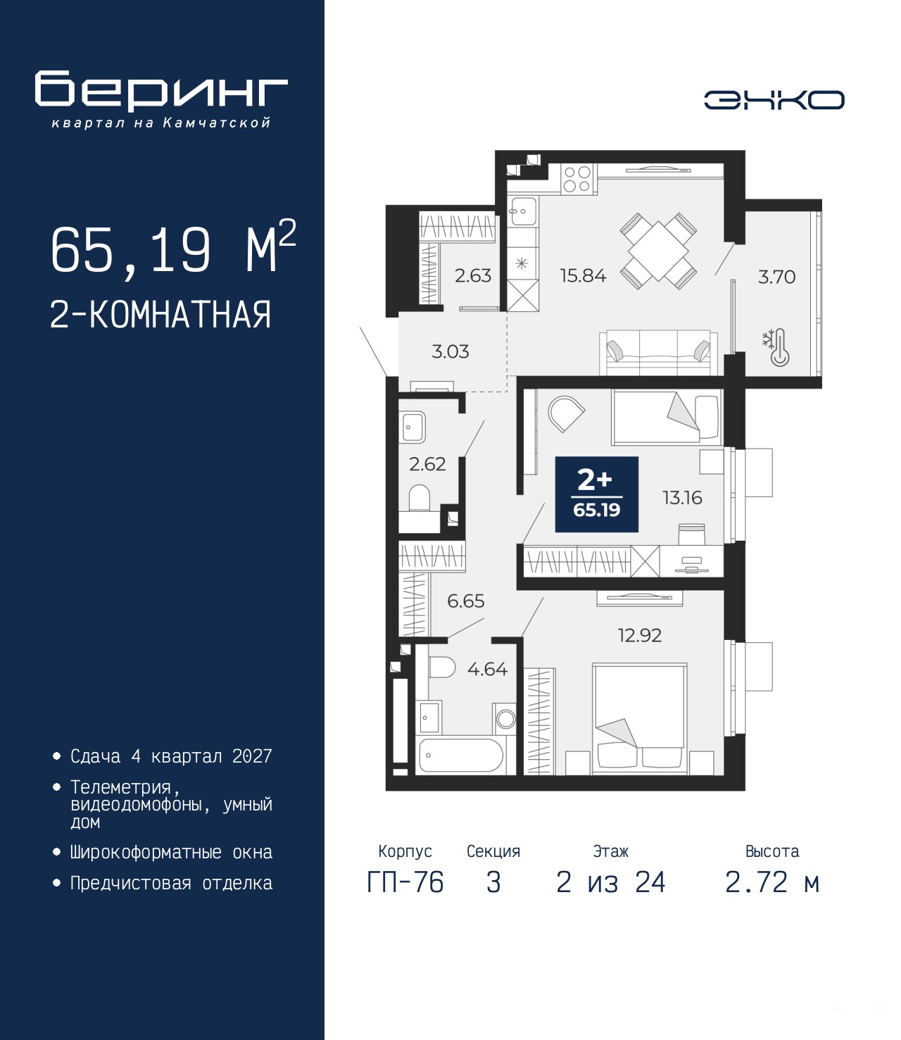 Просторная 2-комн. квартира в ЖК "Беринг" на 2 этаже. Общая площадь: 65.19 кв.м. Высота потолков 2.72 м.
