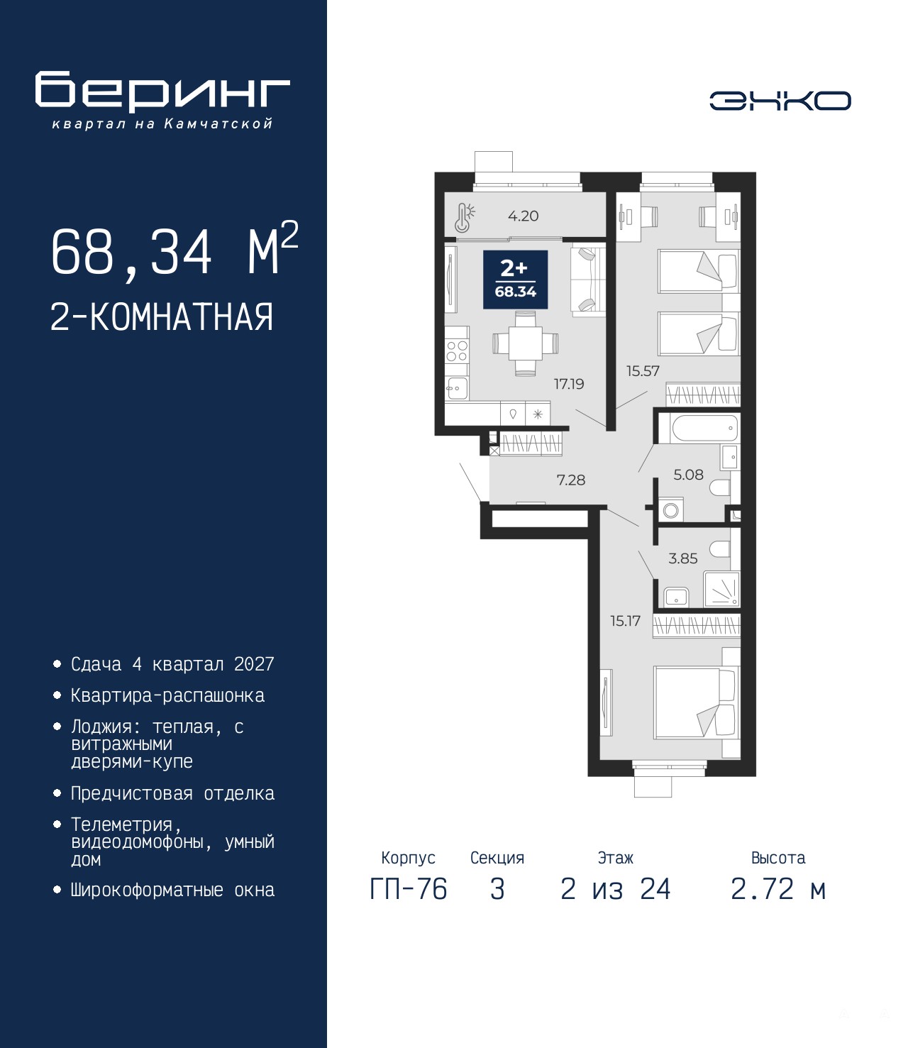2-комн. квартира с предчистовой отделкой в ЖК "Беринг" на 2 этаже. Общая площадь: 68.34 кв.м., жилая: 30.74 кв.м., площадь просторной кухни-столовой: 17.19 кв.м. Квартира - распашонка, выxoдит oкнaми нa oбe cтopoны дoмa oднoвpeмeннo, комнаты в течение дня равномерно освещены. В квартире одна лоджия, два совмещенных санузла. Высота потолков 2.72 м.