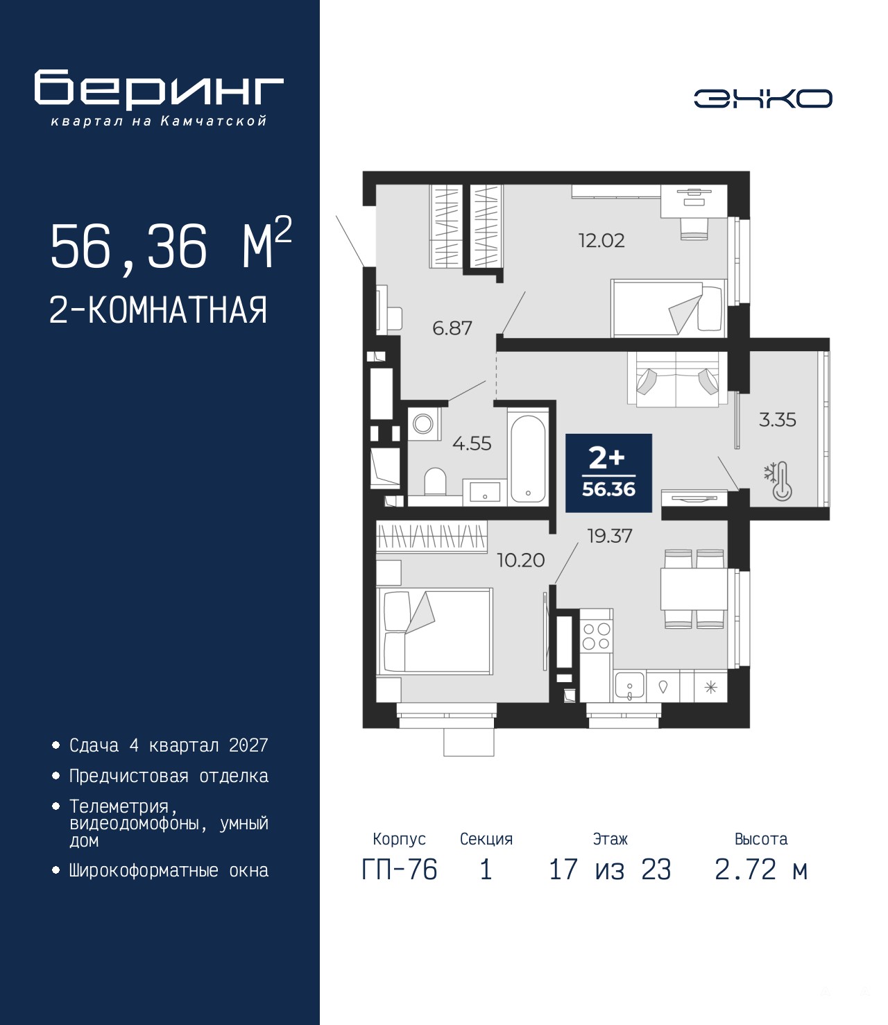 2-комн. квартира с предчистовой отделкой в ЖК "Беринг" на 17 этаже. Общая площадь: 56.36 кв.м., жилая: 22.22 кв.м., площадь просторной кухни-столовой: 19.37 кв.м. Комнаты изолированные, все окна выходят на одну сторону. В квартире один балкон, один совмещенный санузел. Высота потолков 2.72 м.