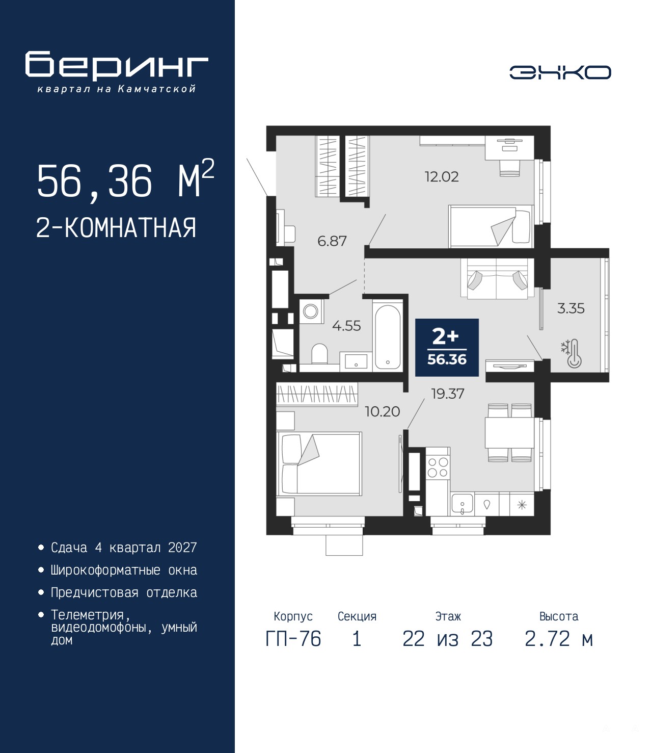 Продается 2-комн. квартира с предчистовой отделкой в ЖК "Беринг" на 22 этаже. Общая площадь: 56.36 кв.м., жилая: 22.22 кв.м., площадь просторной кухни-столовой: 19.37 кв.м. Комнаты изолированные, все окна выходят на одну сторону. В квартире один балкон, один совмещенный санузел. Высота потолков 2.72 м.
