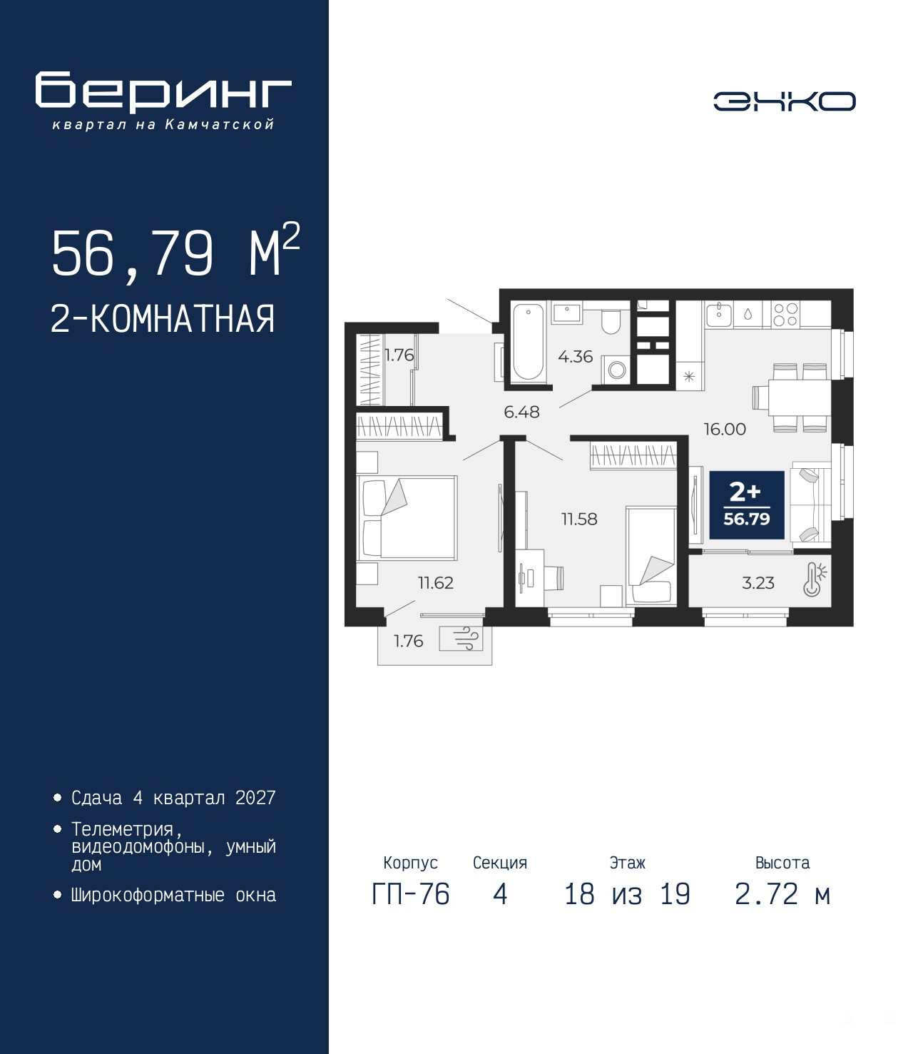 2-комн. квартира от застройщика в ЖК "Беринг" на 18 этаже. Общая площадь: 56.79 кв.м. Высота потолков 2.72 м.