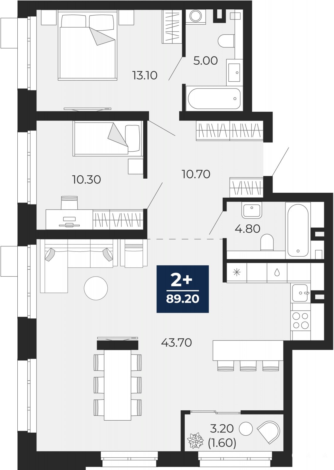 Двухкомнатная квартира от застройщика с предчистовой отделкой в ЖК "Айвазовский City" на 2 этаже. Общая площадь: 89.2 кв.м., жилая: 23.4 кв.м., площадь просторной кухни-столовой: 43.7 кв.м. Угловая квартира, очень светлая, естественная вентиляция при открытии окон. В квартире одна лоджия, два совмещенных санузла. Высота потолков 2.72 м.