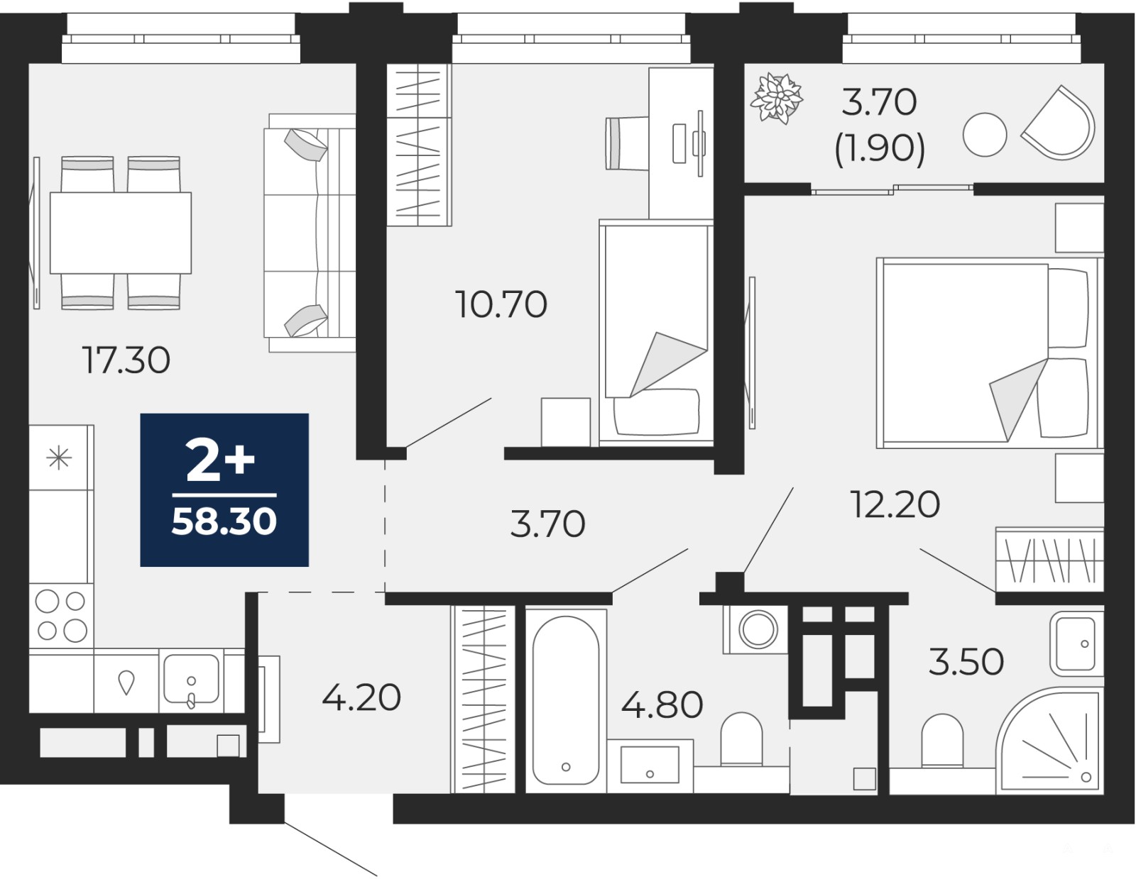 Двухкомнатная квартира с предчистовой отделкой в ЖК "Айвазовский City" на 12 этаже. Общая площадь: 58.3 кв.м., жилая: 22.9 кв.м., площадь просторной кухни-столовой: 17.3 кв.м. Комнаты изолированные, все окна выходят на одну сторону. В квартире одна лоджия, два совмещенных санузла. Высота потолков 2.72 м.