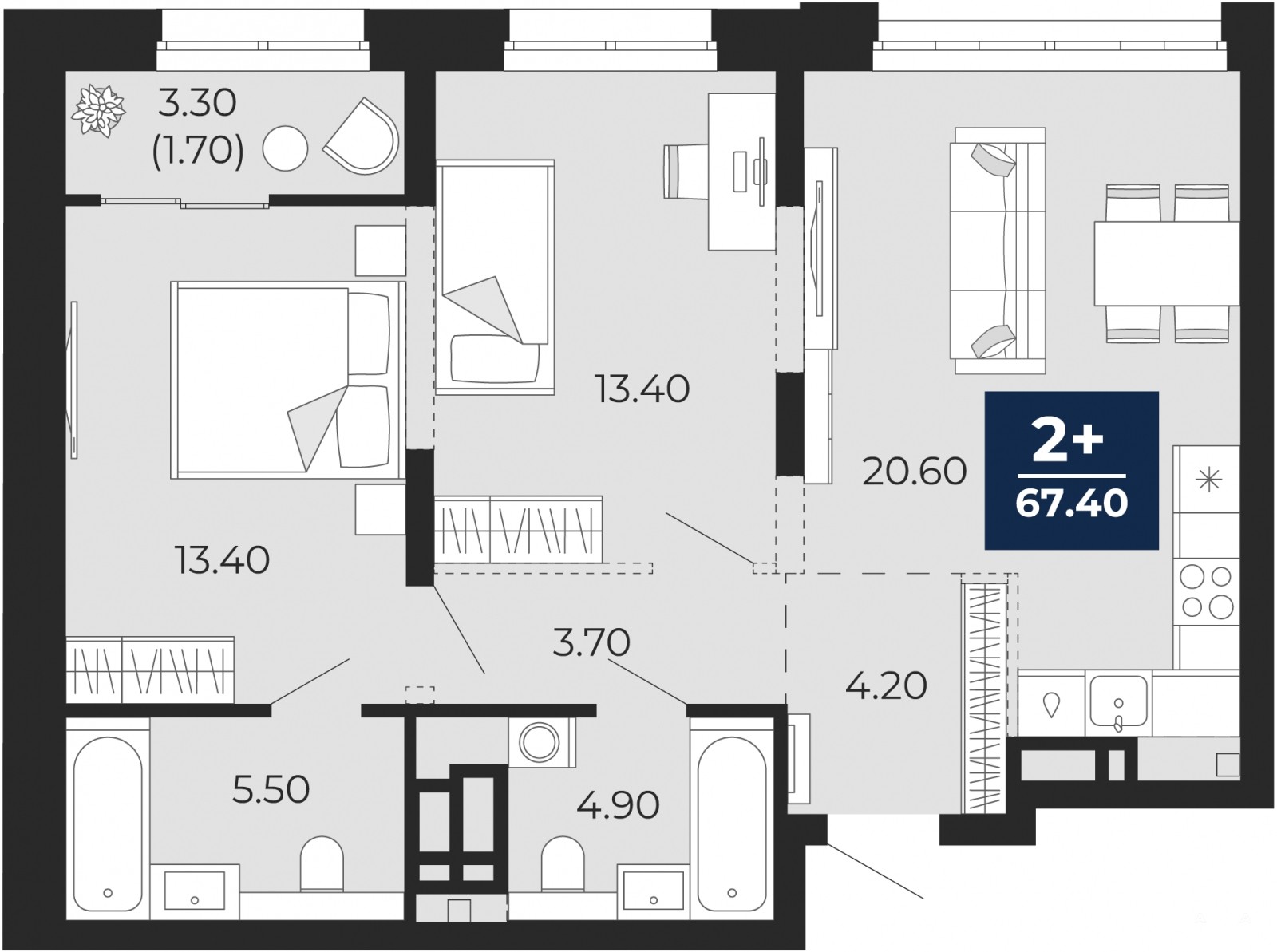 Продается 2-комн. квартира с предчистовой отделкой в ЖК "Айвазовский City" на 8 этаже. Общая площадь: 67.4 кв.м., жилая: 26.8 кв.м., площадь просторной кухни-столовой: 20.6 кв.м. Комнаты изолированные, все окна выходят на одну сторону. В квартире одна лоджия, два совмещенных санузла. Высота потолков 2.72 м.