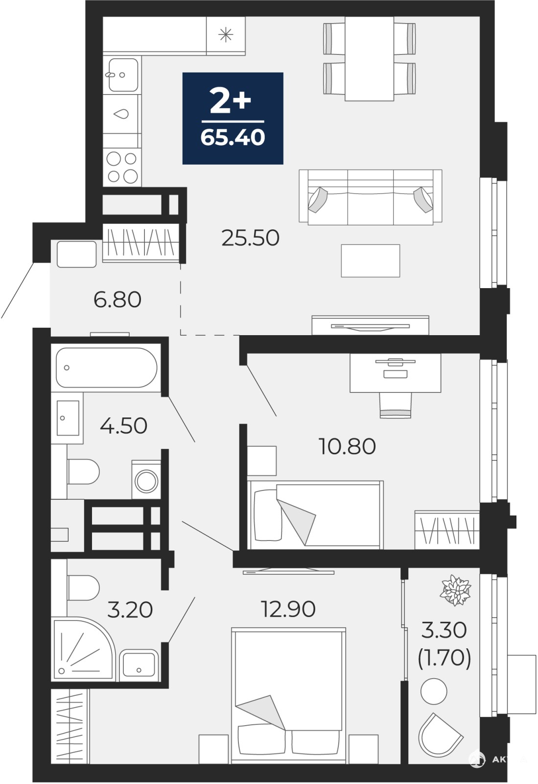 2-комн. квартира с предчистовой отделкой в ЖК "Айвазовский" на 20 этаже. Общая площадь: 67 кв.м., жилая: 23.7 кв.м., площадь просторной кухни-столовой: 25.5 кв.м. Комнаты изолированные, все окна выходят на одну сторону. В квартире одна лоджия, два совмещенных санузла. Высота потолков 2.72 м.