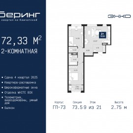 73 м² , 2-комнатную квартиру 31 октября 2025