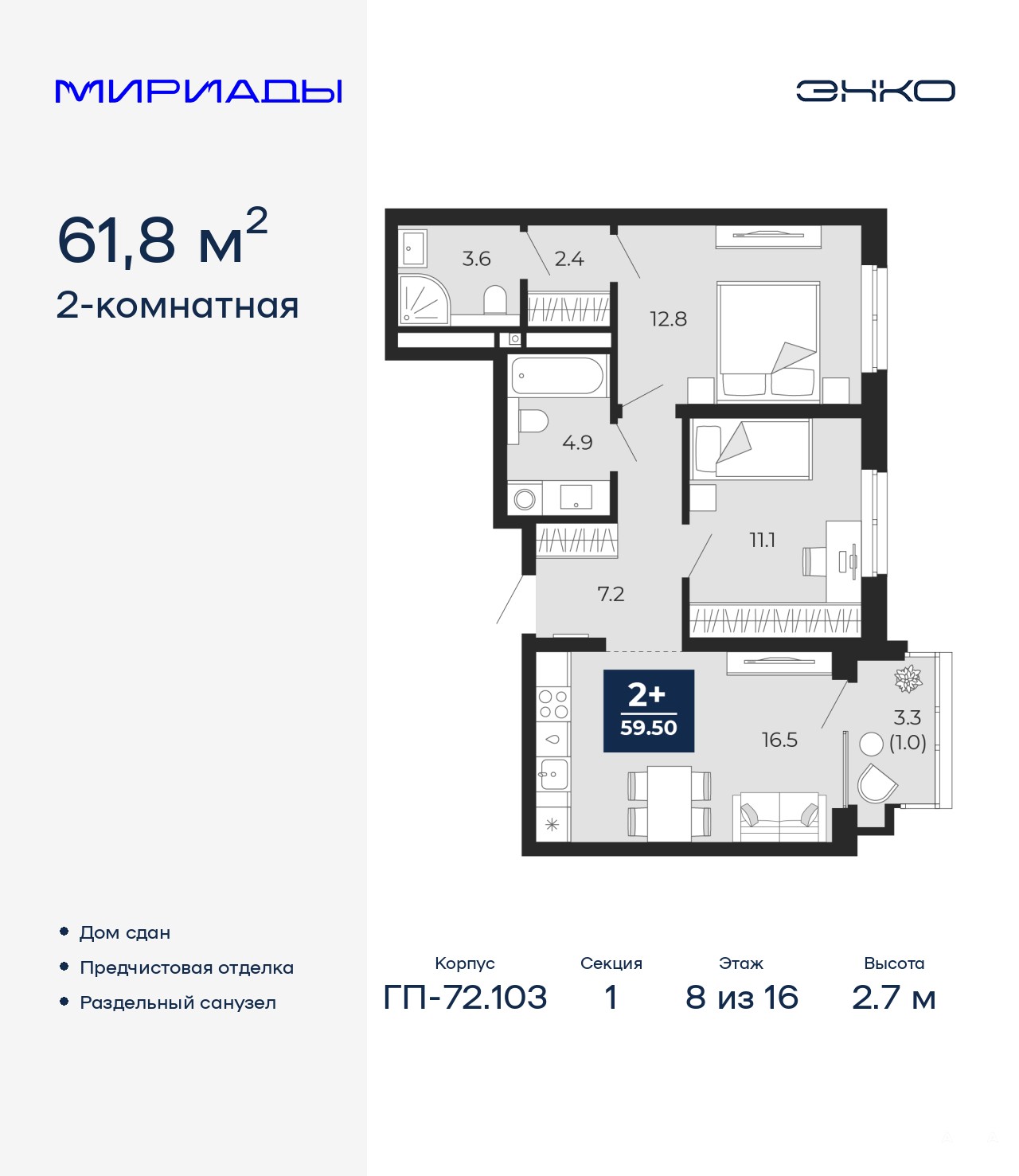 Продается двухкомнатная квартира с предчистовой отделкой в ЖК "Мириады" на 8 этаже. Общая площадь: 61.8 кв.м. Высота потолков 2.7 м.