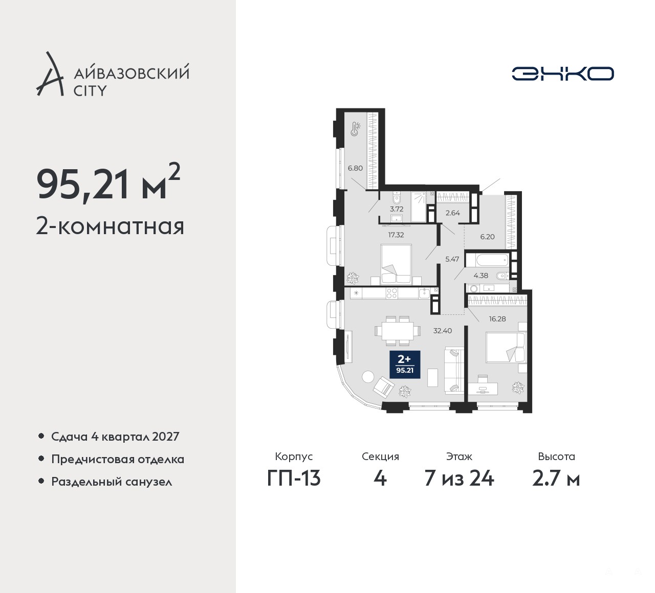 Двухкомнатная квартира с предчистовой отделкой в ЖК "Айвазовский City" на 7 этаже. Общая площадь: 95.21 кв.м., жилая: 33.6 кв.м., площадь просторной кухни-столовой: 32.4 кв.м. Квартира угловая, идеально подойдет любителям тишины и панорамных видов. В квартире два совмещенных санузла. Высота потолков 2.7 м.