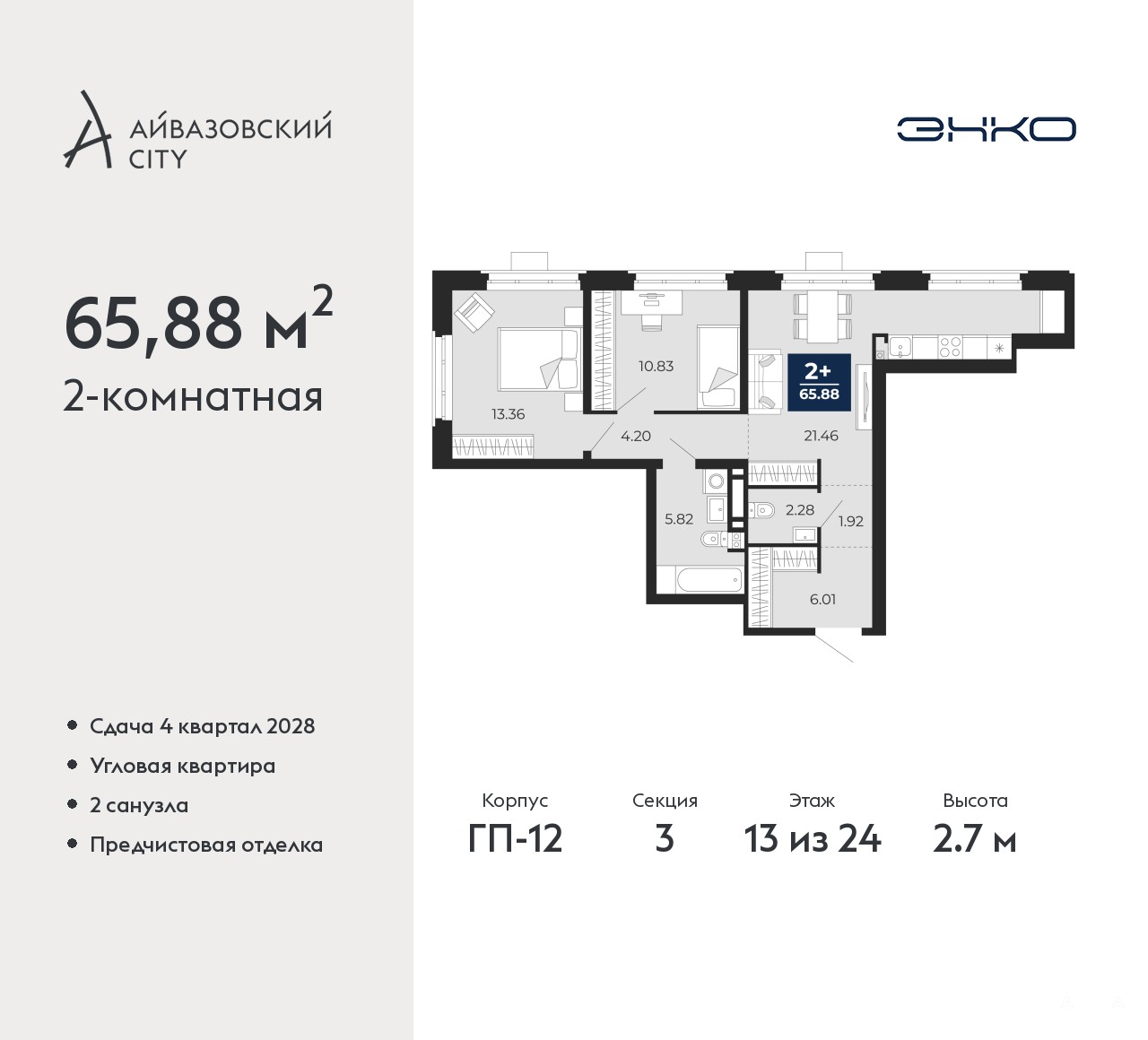 Продается 2-комн. квартира с предчистовой отделкой в ЖК "Айвазовский City" на 13 этаже. Общая площадь: 65.88 кв.м., жилая: 24.19 кв.м., площадь просторной кухни-столовой: 21.46 кв.м. Угловая квартира, идеально подойдет любителям тишины и панорамных видов. В квартире один совмещенный и один раздельный санузел. Высота потолков 2.7 м.