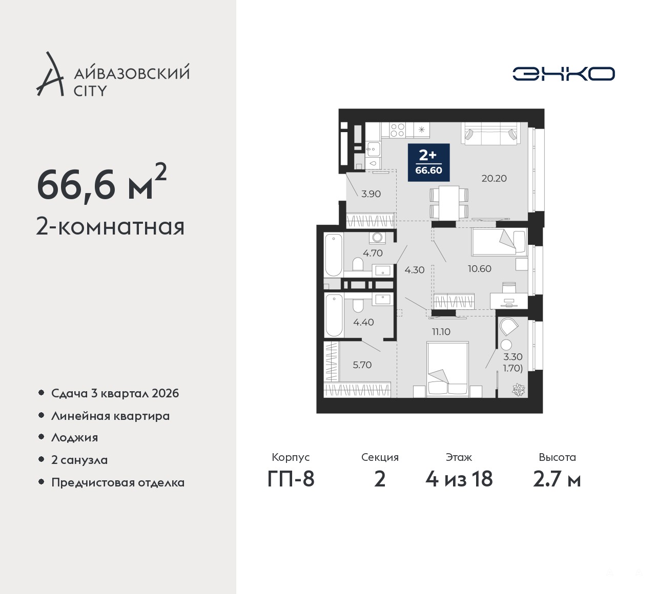 2-комн. квартира от застройщика с предчистовой отделкой в ЖК "Айвазовский City" на 4 этаже. Общая площадь: 66.6 кв.м., жилая: 21.7 кв.м., площадь просторной кухни-столовой: 20.2 кв.м. Комнаты изолированные, все окна выходят на одну сторону. В квартире одна лоджия, два совмещенных санузла. Высота потолков 2.7 м.