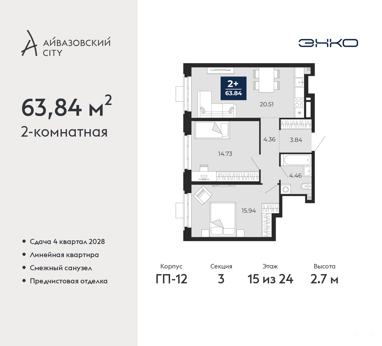 Двухкомнатная квартира от застройщика с предчистовой отделкой в ЖК "Айвазовский City" на 15 этаже. Общая площадь: 63.84 кв.м., жилая: 30.67 кв.м., площадь просторной кухни-столовой: 20.51 кв.м. Комнаты изолированные, все окна выходят на одну сторону. В квартире один совмещенный санузел. Высота потолков 2.7 м.