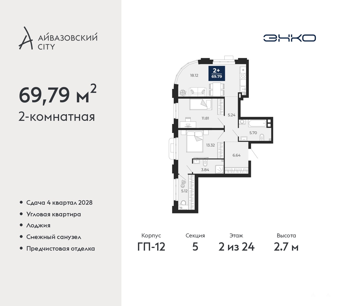 Просторная 2-комн. квартира с предчистовой отделкой в ЖК "Айвазовский City" на 2 этаже. Общая площадь: 69.79 кв.м., жилая: 25.13 кв.м., площадь просторной кухни-столовой: 18.12 кв.м. Квартира угловая, идеально подойдет любителям тишины и панорамных видов. В квартире одна лоджия, один совмещенный санузел. Высота потолков 2.7 м.