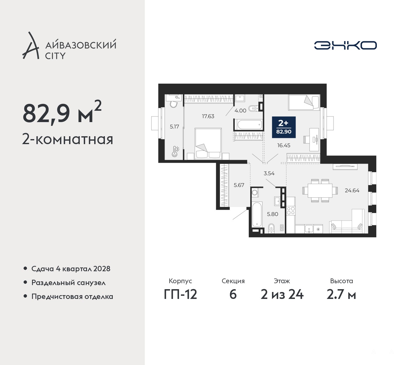 2-комн. квартира с предчистовой отделкой в ЖК "Айвазовский City" на 2 этаже. Общая площадь: 82.9 кв.м. Высота потолков 2.7 м.