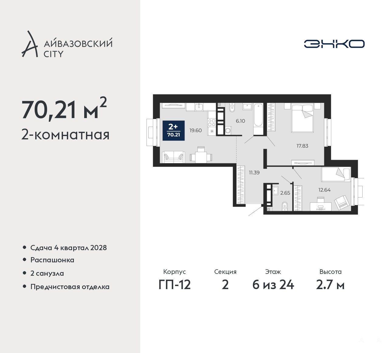 Двухкомнатная квартира с предчистовой отделкой в ЖК "Айвазовский City" на 6 этаже. Общая площадь: 70.21 кв.м., жилая: 30.47 кв.м., площадь просторной кухни-столовой: 19.6 кв.м. Квартира - распашонка, без проходных комнат, окна выходят на paзные стороны дома. В квартире один совмещенный и один раздельный санузел. Высота потолков 2.7 м.