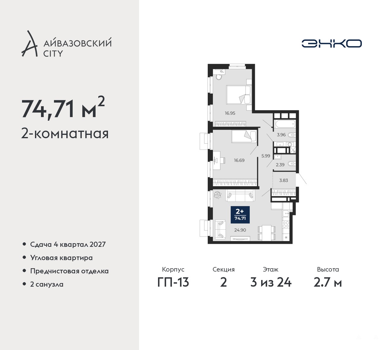 2-комн. квартира с предчистовой отделкой в ЖК "Айвазовский City" на 3 этаже. Общая площадь: 74.71 кв.м., жилая: 33.64 кв.м., площадь просторной кухни-столовой: 24.9 кв.м. Квартира угловая, очень светлая, естественная вентиляция при открытии окон. В квартире один совмещенный и один раздельный санузел. Высота потолков 2.7 м.