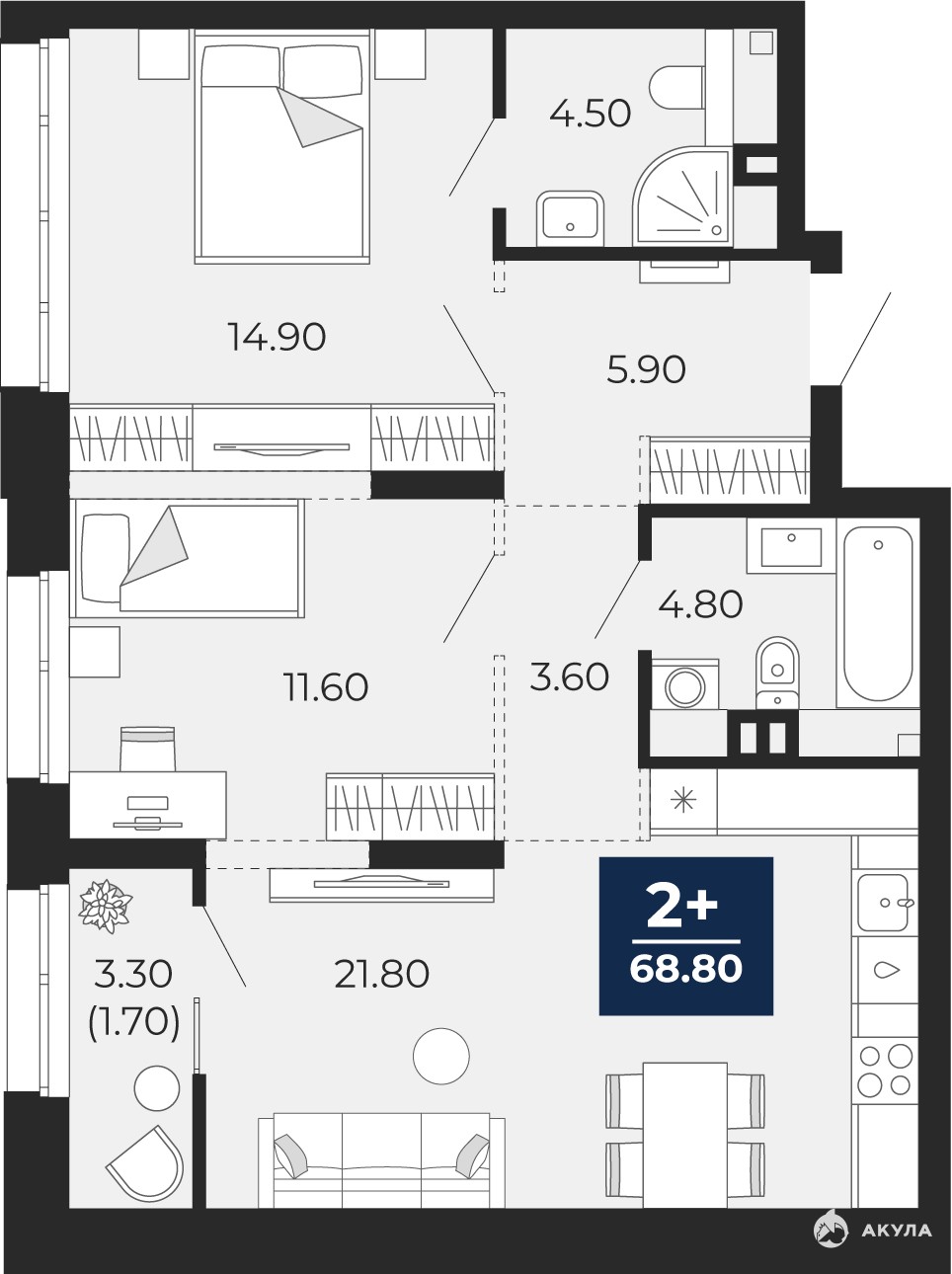 2-комн. квартира от застройщика с предчистовой отделкой в ЖК "Айвазовский City" на 2 этаже. Общая площадь: 68.8 кв.м., жилая: 26.5 кв.м., площадь просторной кухни-столовой: 21.8 кв.м. Комнаты изолированные, все окна выходят на одну сторону. В квартире одна лоджия, два совмещенных санузла. Высота потолков 2.7 м.
