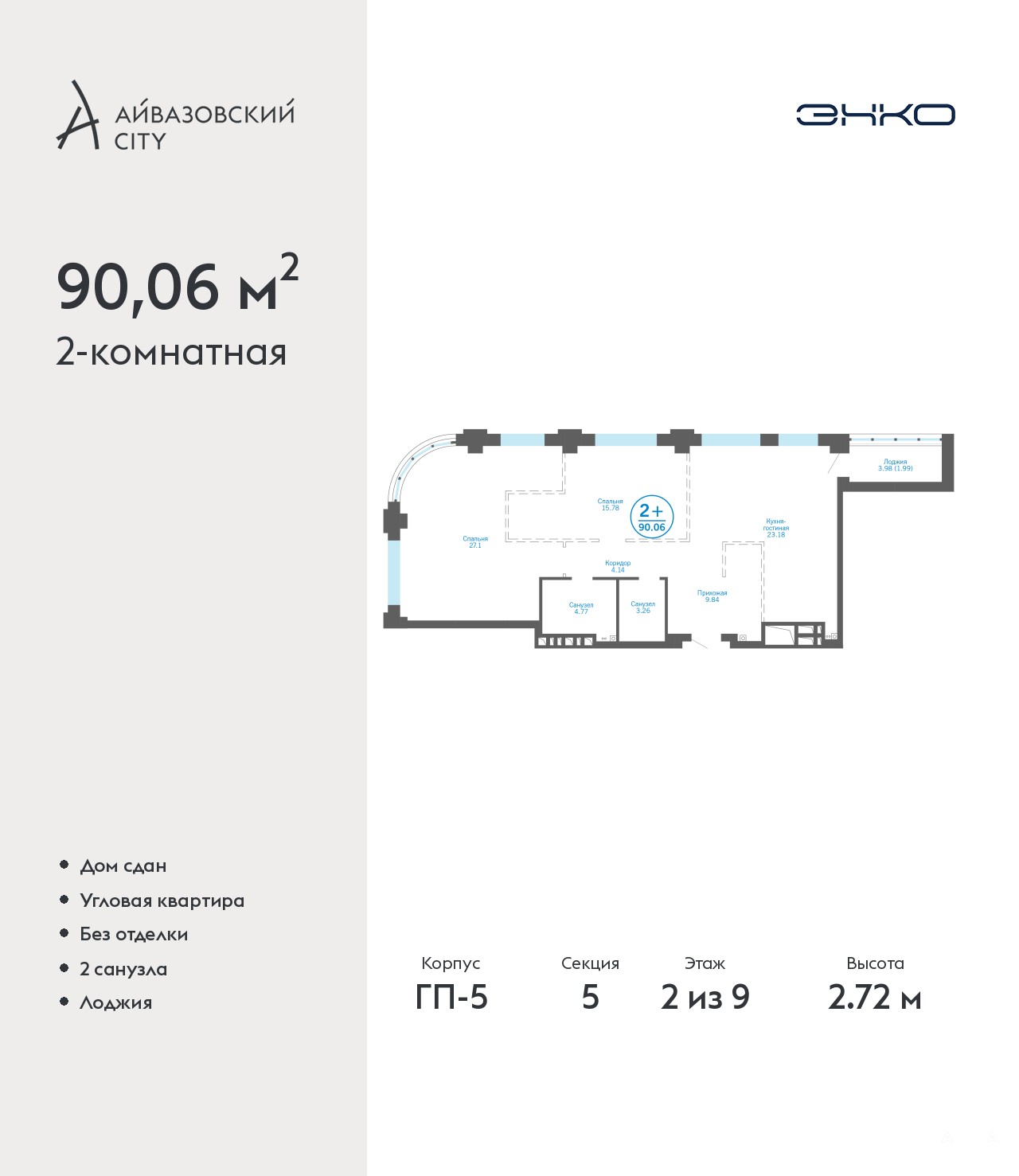 Двухкомнатная квартира от застройщика в ЖК "Айвазовский City" на 2 этаже. Квартира без отделки, новый владелец может сделать ремонт по своему проекту. Общая площадь: 90.06 кв.м., жилая: 42.88 кв.м., площадь просторной кухни-столовой: 23.18 кв.м. Квартира угловая, очень светлая, естественная вентиляция при открытии окон. В квартире одна лоджия, два совмещенных санузла. Высота потолков 2.72 м.