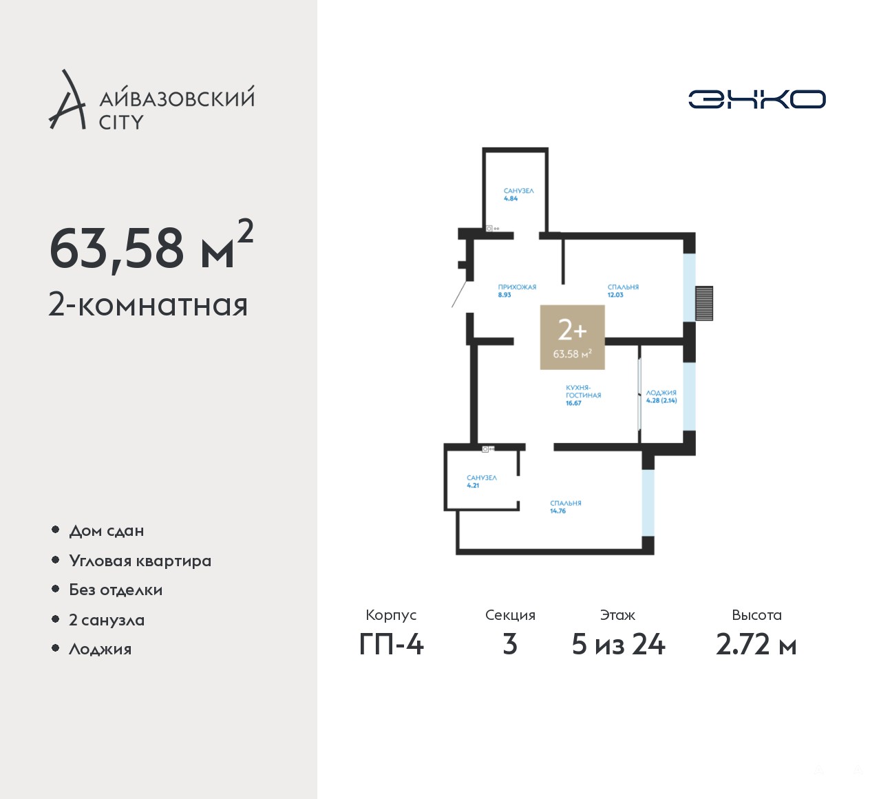 Продается 2-комн. квартира в ЖК "Айвазовский City" на 5 этаже. Квартира без отделки, после оформления собственности можно делать ремонт. Общая площадь: 63.58 кв.м., жилая: 26.79 кв.м., площадь просторной кухни-столовой: 16.67 кв.м. Угловая квартира, окна oбecпeчивaют paвнoмepнoe ocвeщeниe в тeчeниe дня. В квартире одна лоджия, два совмещенных санузла. Высота потолков 2.72 м.
