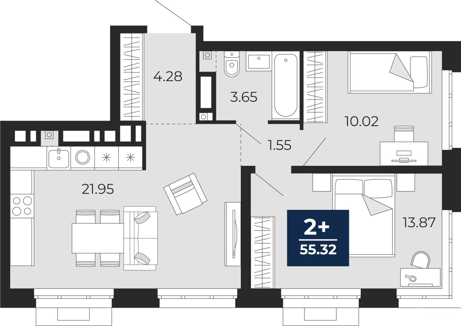 2-комн. квартира с предчистовой отделкой в ЖК "Айвазовский" на 8 этаже. Общая площадь: 55.32 кв.м., жилая: 23.89 кв.м., площадь просторной кухни-столовой: 21.95 кв.м. Квартира угловая, очень светлая, естественная вентиляция при открытии окон. В квартире один совмещенный санузел. Высота потолков 2.7 м.