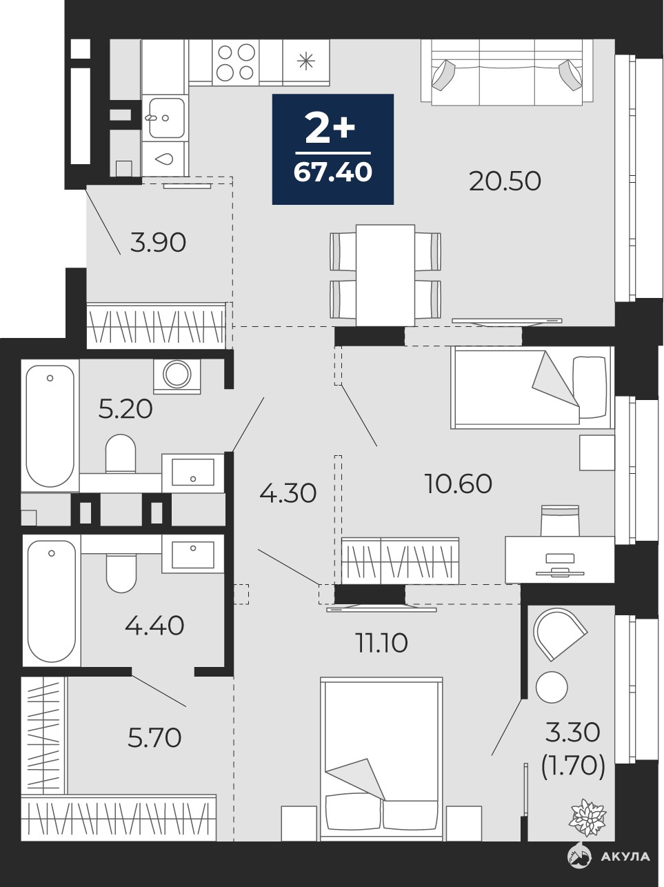 Двухкомнатная квартира от застройщика с предчистовой отделкой в ЖК "Айвазовский" на 2 этаже. Общая площадь: 69 кв.м. Высота потолков 2.7 м.