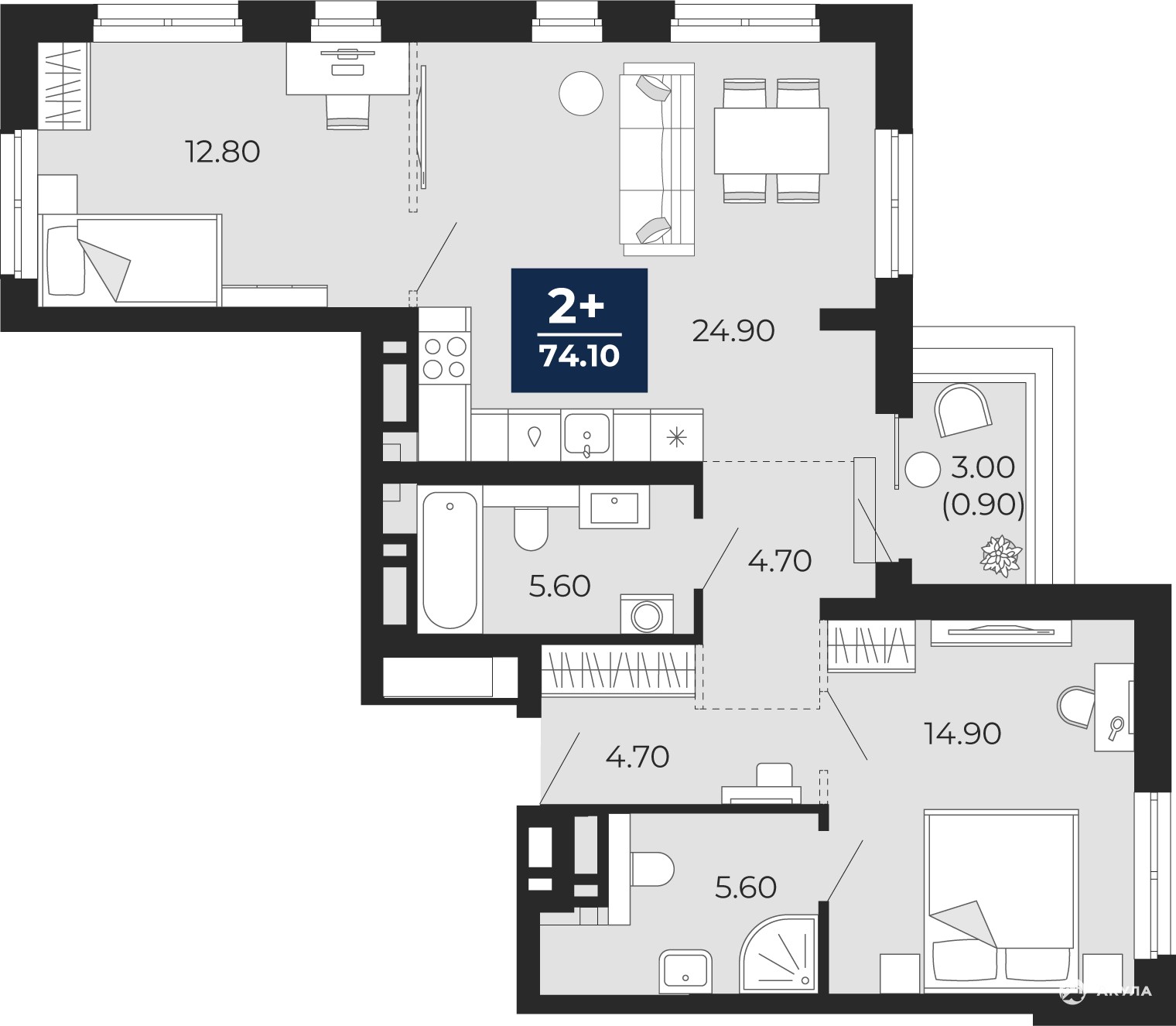 Двухкомнатная квартира с предчистовой отделкой в ЖК "Айвазовский" на 18 этаже. Общая площадь: 76.2 кв.м. Высота потолков 2.7 м.