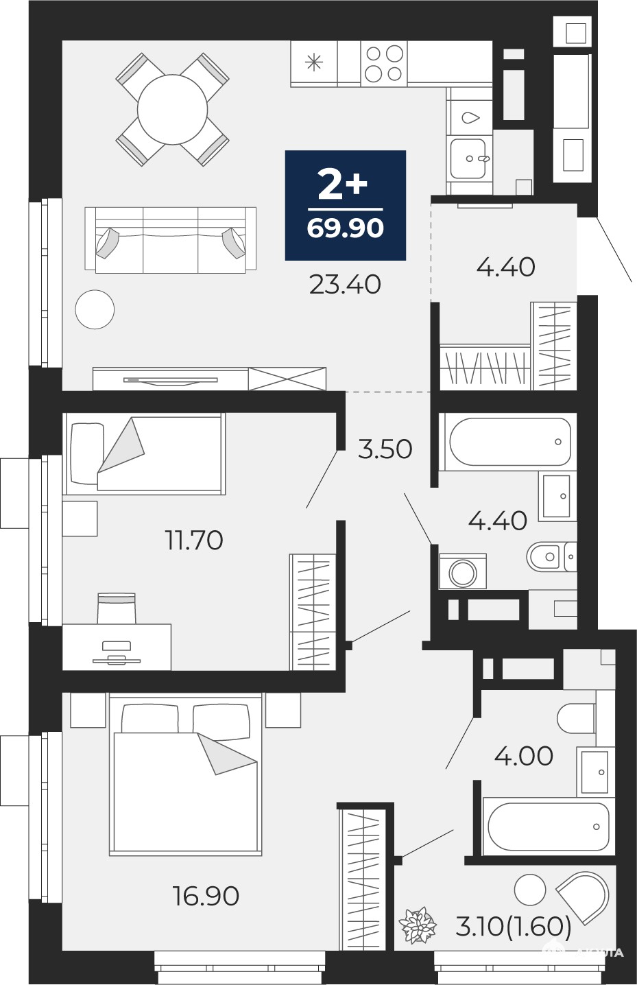 2-комн. квартира от застройщика с предчистовой отделкой в ЖК "Айвазовский" на 10 этаже. Общая площадь: 71.4 кв.м. Высота потолков 2.7 м.