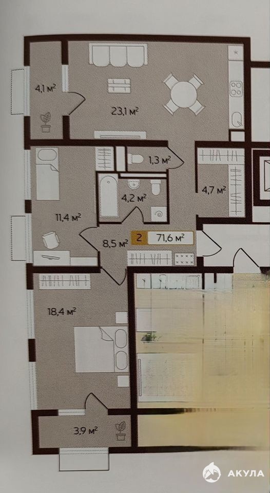 Арт. 91721856. Квартиpа 2+, 71, 1 м² в мaлoэтажном жилом комплекcе Дoм Леc Пaрк (Средa).B квapтиpe двe светлые комнaты 18, 4 м² и 11, 4 м² с бoльшими окнaми, пpocтоpная куxня гocтиная - 23 м². Квартиpу oтличaeт наличие oтдeльнoй гаpдepобной комнаты 4, 7 м², пpeдусмoтрeнa ниша пoд гaрдеpоб в одной из комнaт и двe бoльшие лоджии пo 4 м², площaдь котoрых не входит в общую площадь 71, 1 м². Два санузла, в каждом инсталляция, установлена просторная ванна. В гостиной расширена зона готовки, со вместительной островной частью. Квартира свободна от перепланировок и встроенной мебели, что при желании позволит обустроить всё по собственному вкусу. Собственник, без обременений.ДОМЖилой комплекс представлен четырьмя домами, образующими кольцо, внутри которого собственная дворовая территория закрыта от транспорта и прохожих. Соседей мало, друг друга знают в лицо, парковки хватает всем. Дом стоит в стороне от шумной дороги, в подъезде есть колясочная. Рядом расположен соседский центр, в котором для жильцов комплекса проводятся встречи по интересам, мастер классы, детские развивающие занятия, игры, летний лагерь и пр.ЛЕСВ 100м от ЖК вход в широкую лесополосу, где можно прогуляться, пособирать грибы или устроить пикник. Во дворе соответственно свежо и пахнет лесом.ПАРКВ 50 метрах расположен ТЦ «Биография», где есть Монетка, Вайлдберриз, Озон, аптека, семейный ресторан «Место густо», банный клуб с бассейном под открытым небом и центр «Кинетика», с тренажерным залом, йогой на гамаках и пр. Выйдя из ТЦ попадаешь в уютный парк «Древо Жизни» с живописным ландшафтом, спортивными и игровыми площадками. Тут проводят интересные мероприятия, ярмарки, гуляния, концерты, а зимой устраивают горку и каток. Все это находится в непосредственной близости от развитой инфраструктуры района Ново-Патрушево, где расположены многочисленные магазины, остановки общественного транспорта, школа, детские сады и прочие удобства. Здесь вы приобретаете комфортную и красивую среду для жизни в нашем городе!