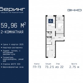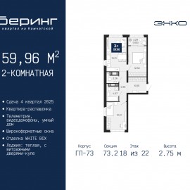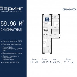 Двухкомнатная квартира в ЖК "Беринг" на 18 этаже. Квартира без отделки, новый собственник может сделать ремонт по своему проекту. Общая площадь: 59.96 кв.м., жилая: 25.01 кв.м., площадь просторной кухни-столовой: 15.21 кв.м. Квартира - распашонка, без проходных комнат, окна выходят на...