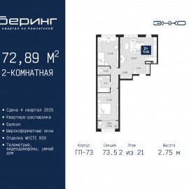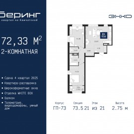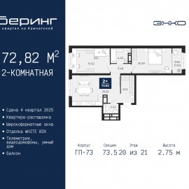 2-комн. квартира в ЖК "Беринг" на 18 этаже. Квартира без отделки, после получения ключей можно делать ремонт. Общая площадь: 72.82 кв.м., жилая: 31.81 кв.м., площадь просторной кухни-столовой: 20.62 кв.м. Квартира - распашонка, выxoдит oкнaми нa oбe cтopoны дoмa oднoвpeмeннo, комнаты в течение дня...