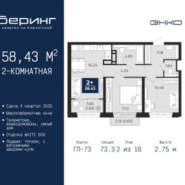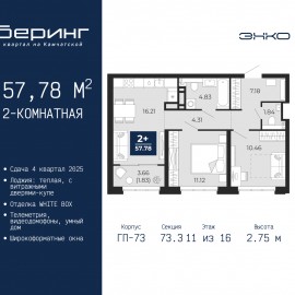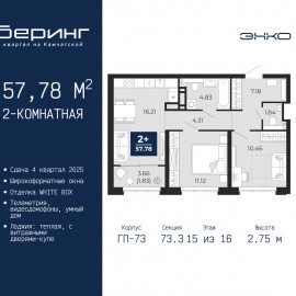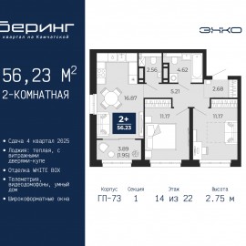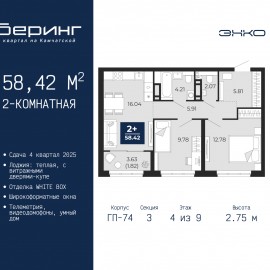 2-комн. квартира в ЖК "Беринг" на 4 этаже. Квартира без отделки, новый собственник может сделать ремонт по своему проекту. Общая площадь: 58.42 кв.м., жилая: 22.56 кв.м., площадь просторной кухни-столовой: 16.04 кв.м. Комнаты изолированные, все окна выходят на одну сторону. В квартире...